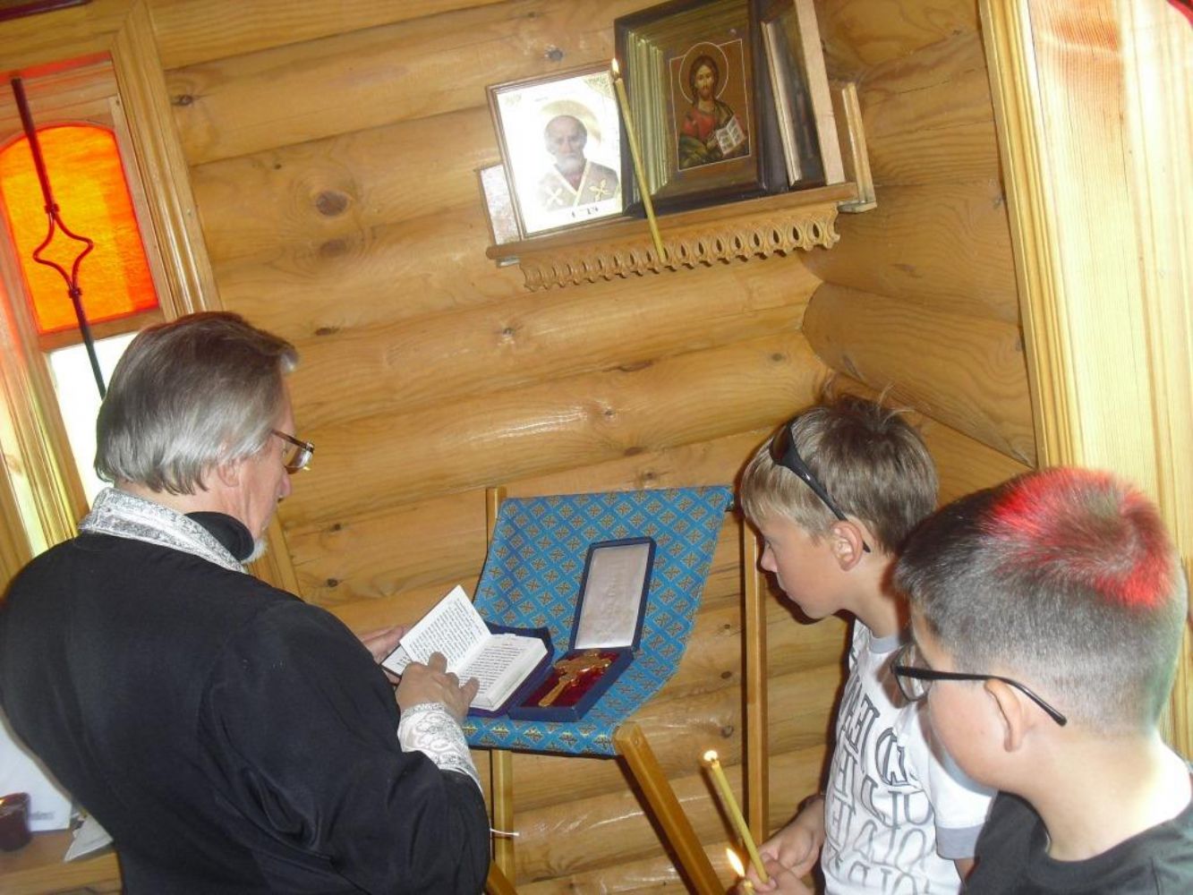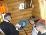 В часовню вошли все паломники. Вместе с батюшкой отслужили молебен. После молитвы, на крылечке часовни, слушали рассказ отца Николая о строительстве часовни и житии святого великомученика: