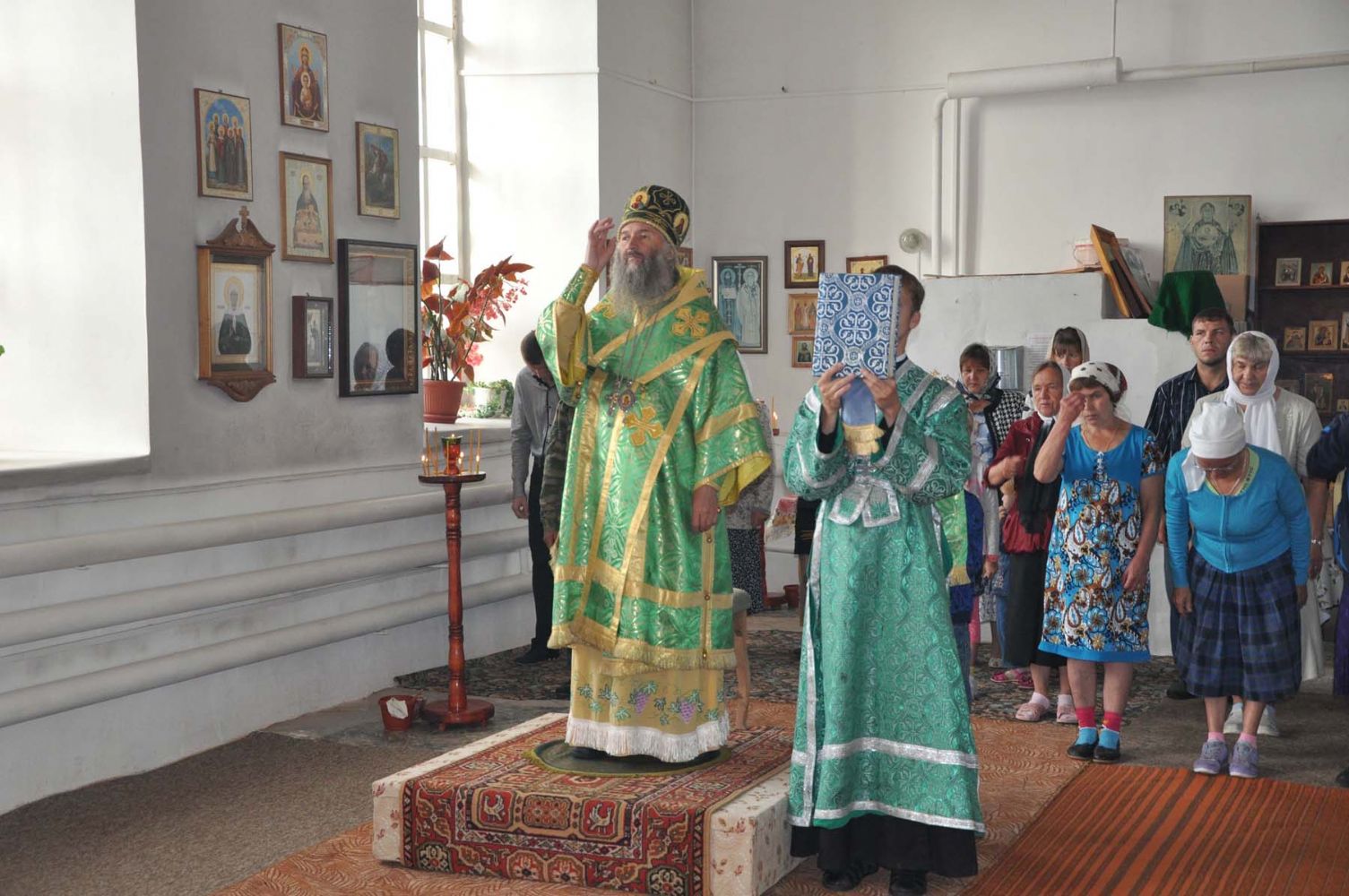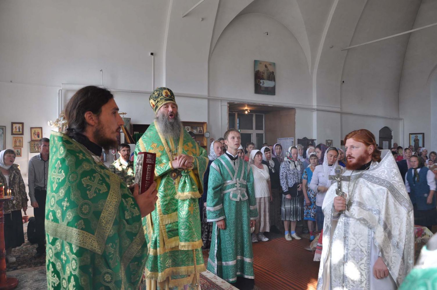 Божественная литургия началась со встречи Его Высокопреосвященства в 8 часов. После Литургии в честь престольного праздника был отслужен праздничный молебен и совершен крестный ход вокруг храма.