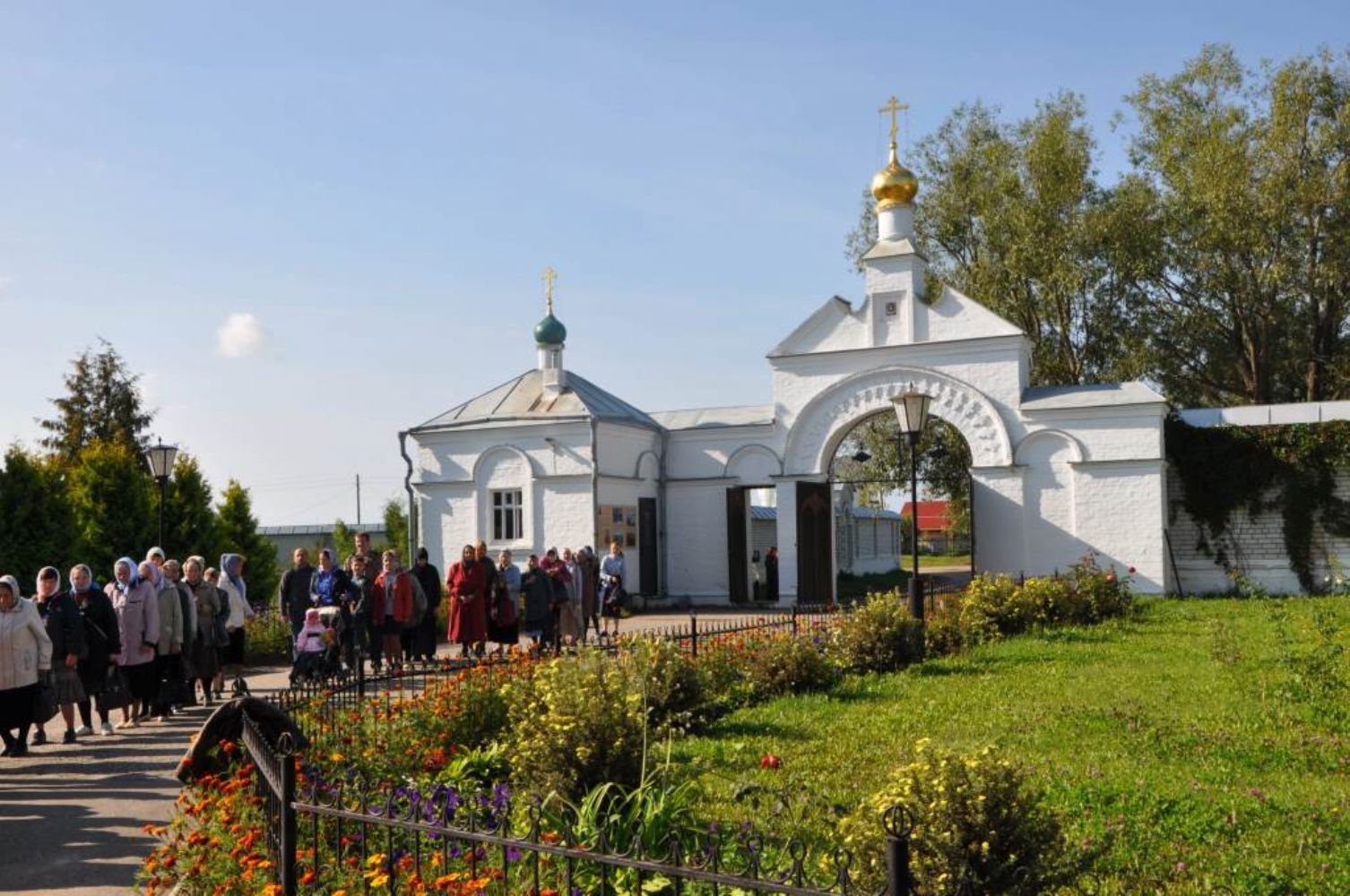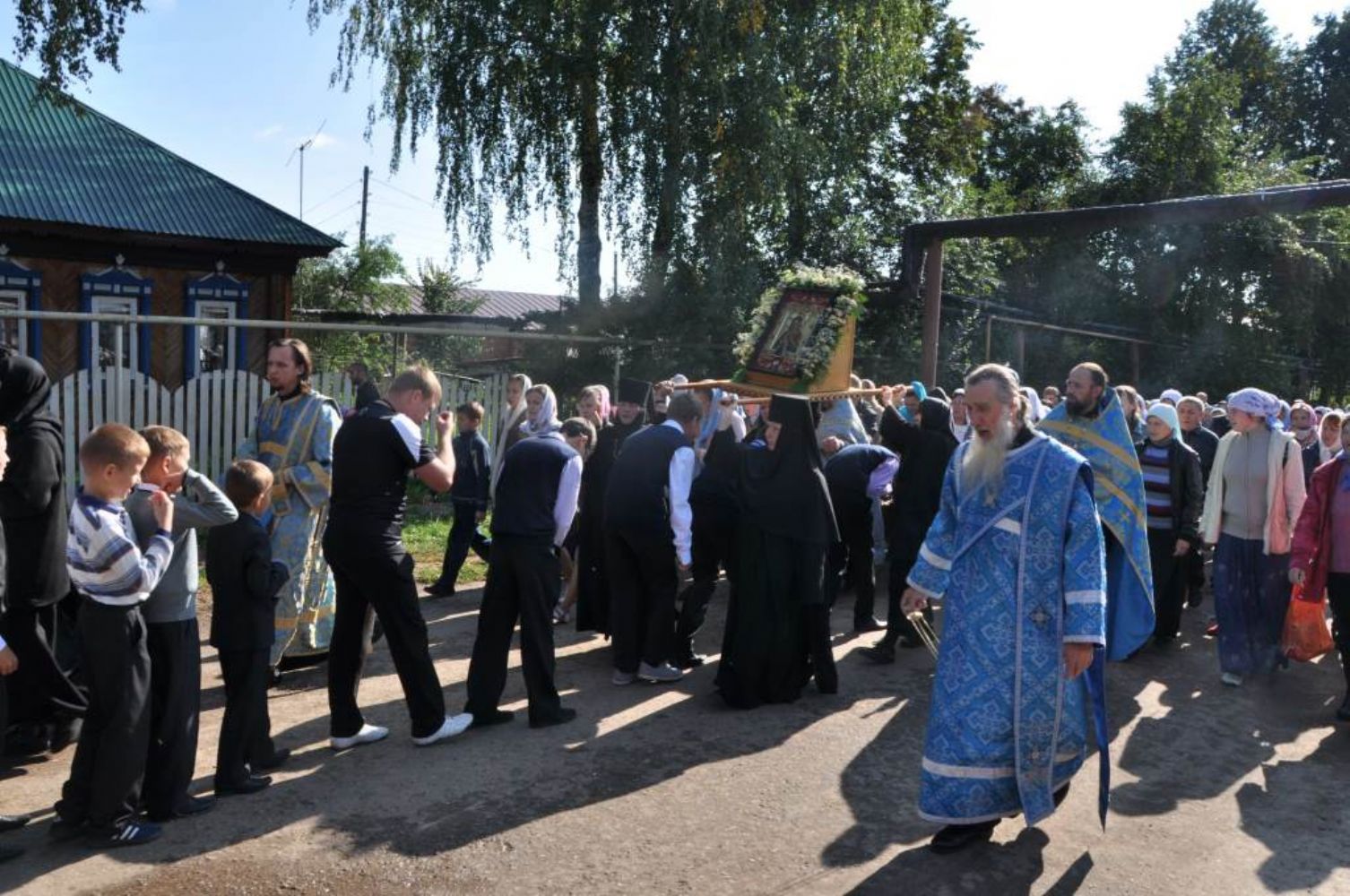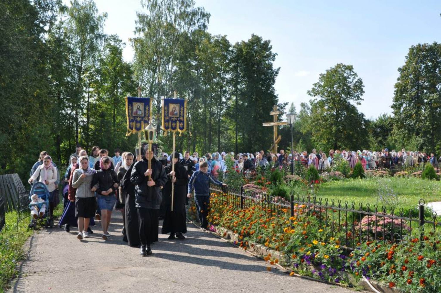 После Литургии и общей трапезы начался молебен и крестный ход. Обойдя монастырь священство и многочисленные паломники отправились крестным ходом в с. Семеновка. Среди паломников были гости из Чувашской республики и Нижегородской области.