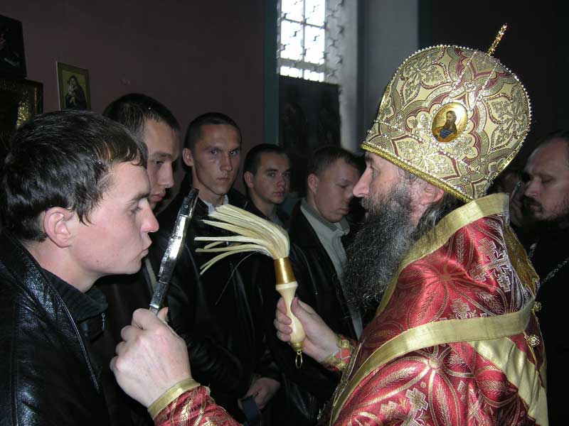 После литургии, крестного хода и окропления святой водой, Владыка пригласил юношей в алтарь. О чем он беседовал с призывниками, для прихожан осталось тайной. Однако из алтаря будущие защитники Родины выходили окрыленными. «На душе спокойнее стало, легче пойдем служить», — по-мужски немногословно отвечали они на вопросы журналистов.