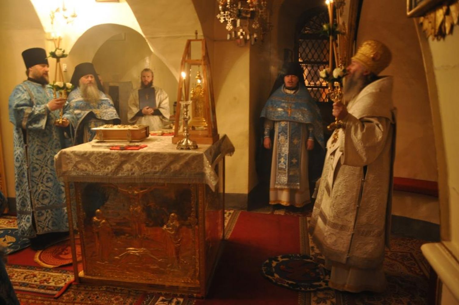 Во время посещения обители 4 февраля Владыка совершил панихиду в Богом зданных пещерах на месте упокоения усопших насельников монастыря. Вечером Владыка молился за Богослужением в Успенском храме, в котором находятся чудотворная икона Божией Матери Успение и мощи прп. Корнилия основателя Псково-Печерского монастыря.