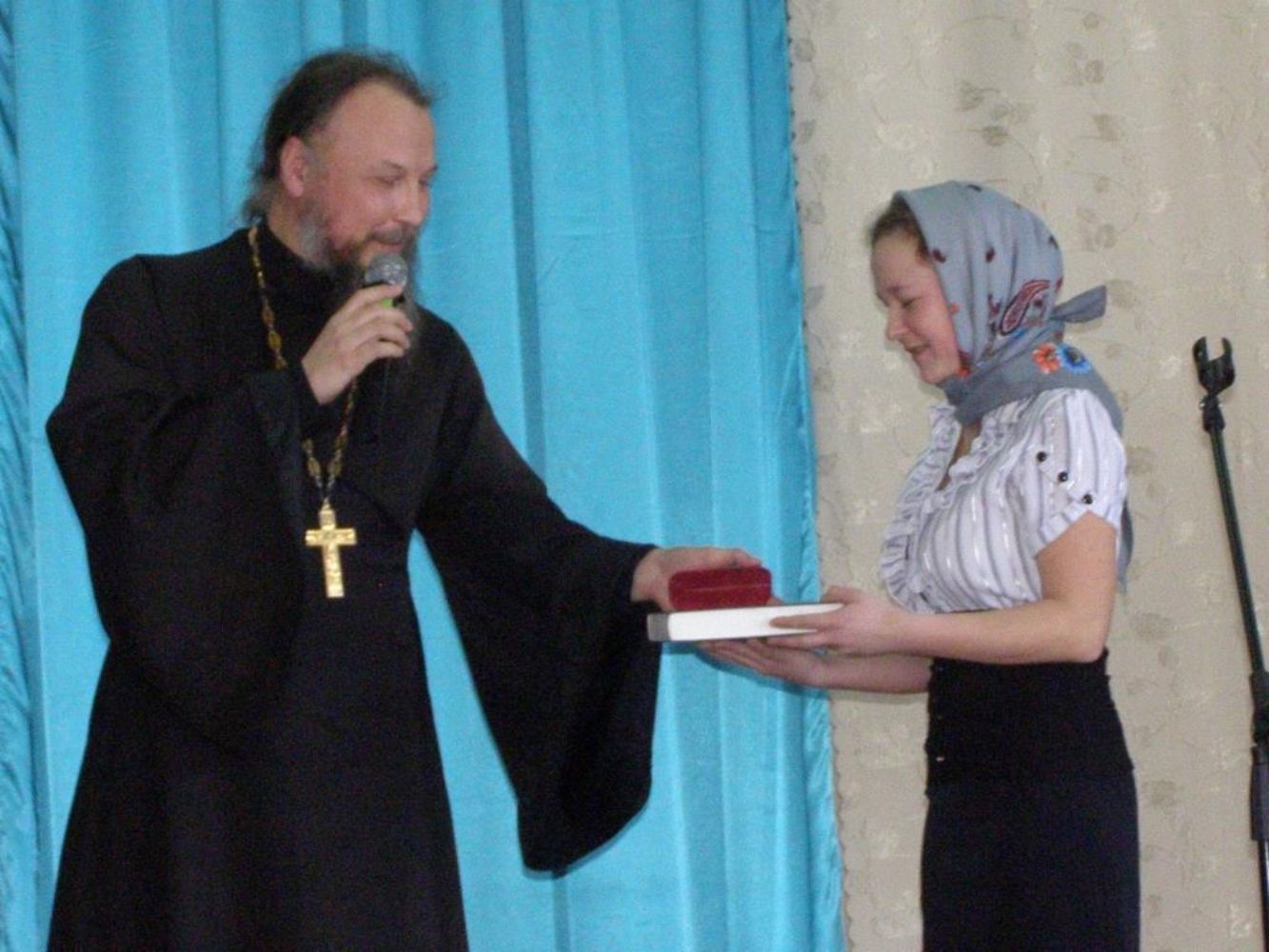 А еще оказалось, что и в нашем районе есть настоящие герои. Свой героический поступок десятиклассница Арина Кондратьева из деревни Лопово совершила, когда ей исполнилось всего 5 лет. Из горящего дома она смогла вытолкнуть на улицу двух малышей. Об этом рассказала инструктор по пожарной профилактике, активная прихожанка Н.В.Кузьминых, которая и вела программу праздника. Благочинный подарил юной героине духовные книги и цветы.