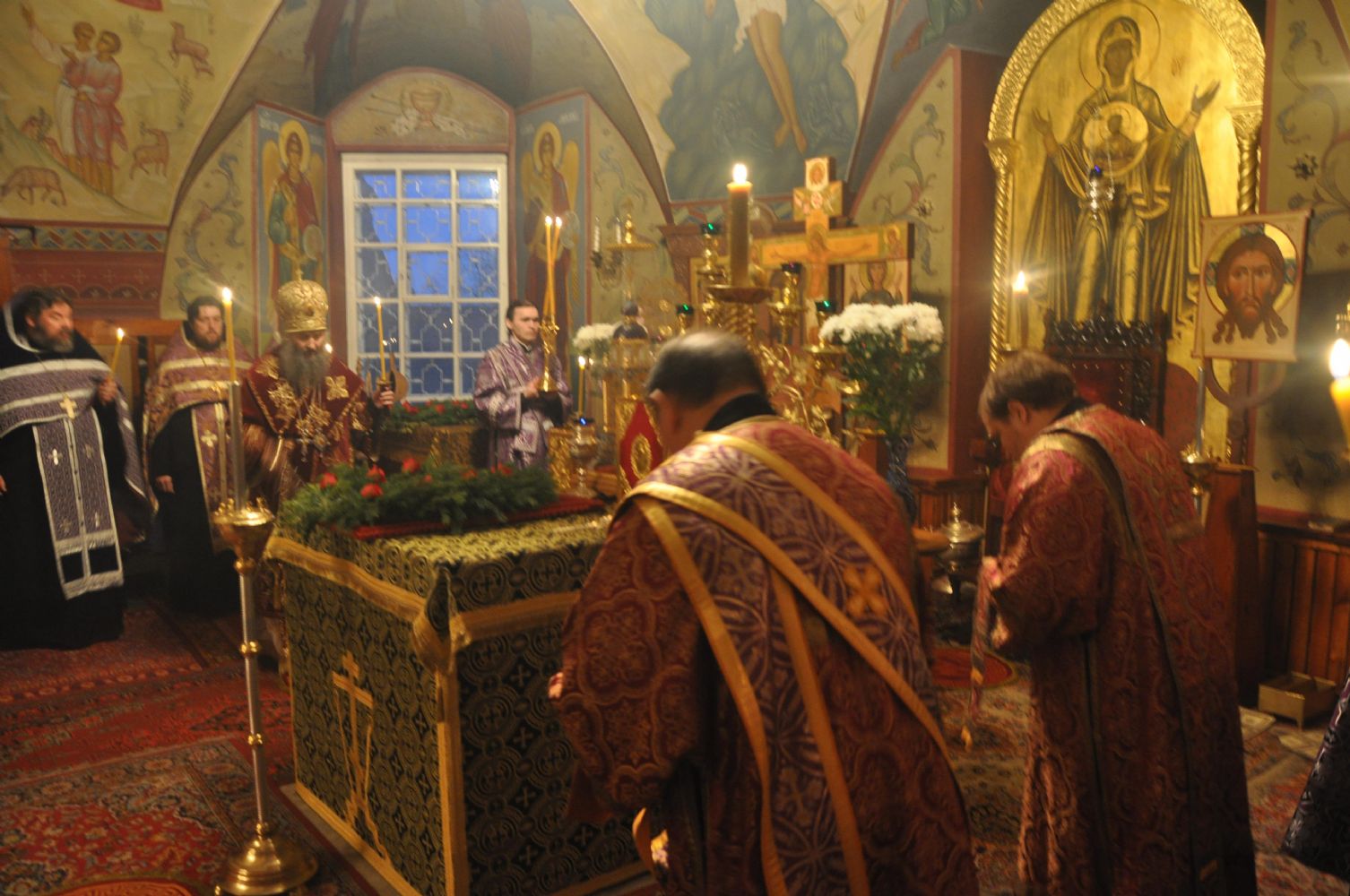 Вечером того же дня Его Высокопреосвященство возглавил Всенощное бдение с чином выноса Честного и Животворящего Креста Господня в Вознесенском кафедральном соборе. Сослужили Владыке его клирики.