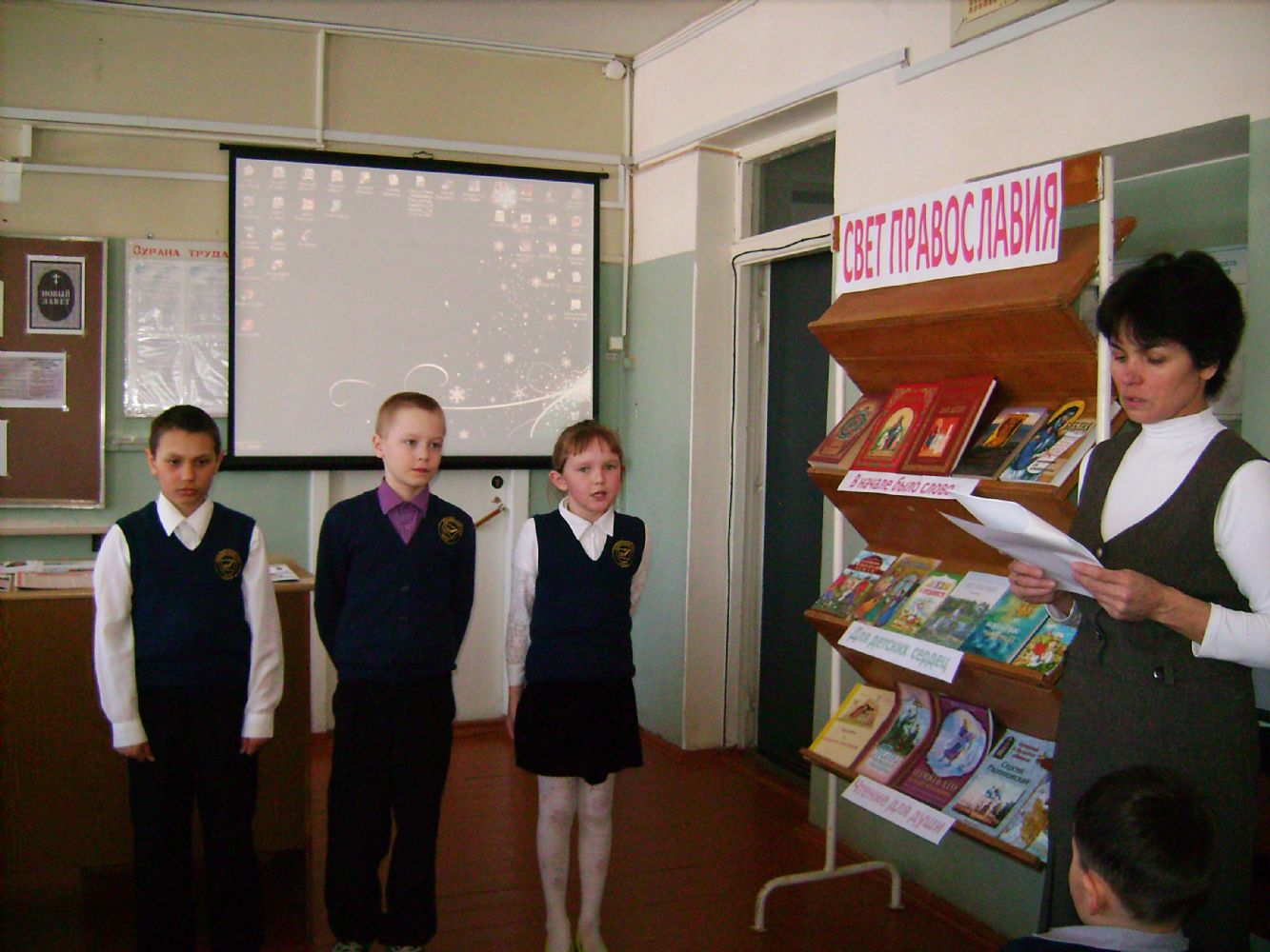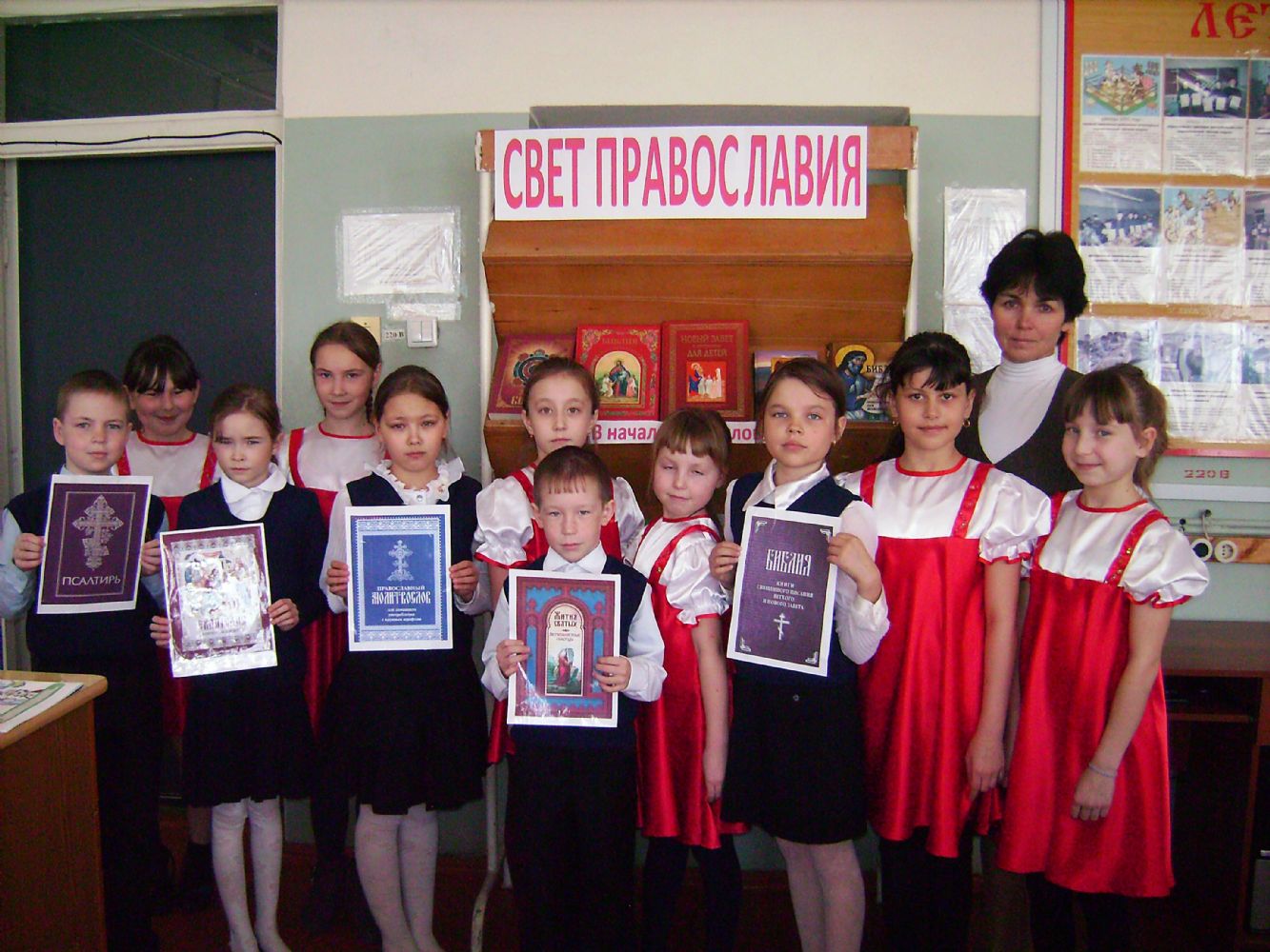 Учитель начальных классов Елена Николаевна Громова, обращаясь к учащимся, отметила, что читая на уроках литературного чтения различные произведения, нельзя различить духовные они или светские. Все они учат любить Родину, следовать нравственным заповедям, которые были прописаны в глубокой древности в нашей Библии, любить и уважать друг друга, ценить. И всему этому учит книга.