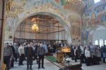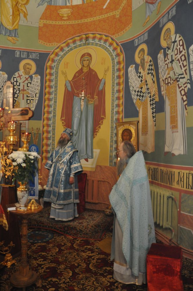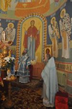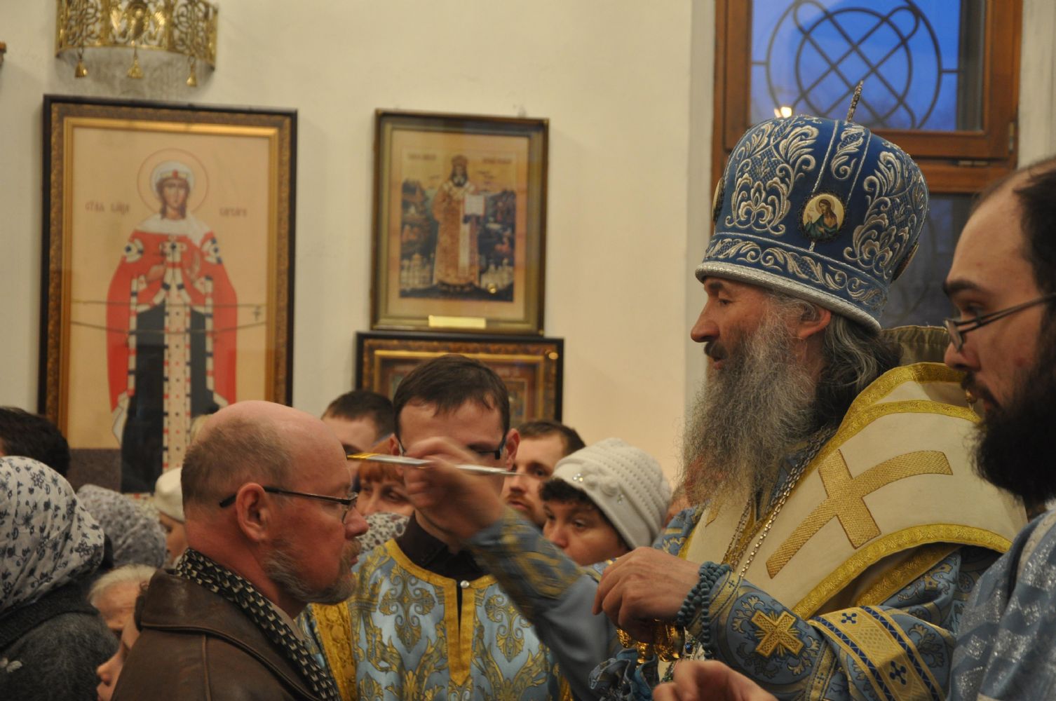 Его Высокопреосвященству сослужили: настоятель храма, секретарь епархиального управления митрофорный протоиерей Сергий Филонов, иеромонах Серафим (Пасанаев) и иерей Алексий Михеев.