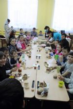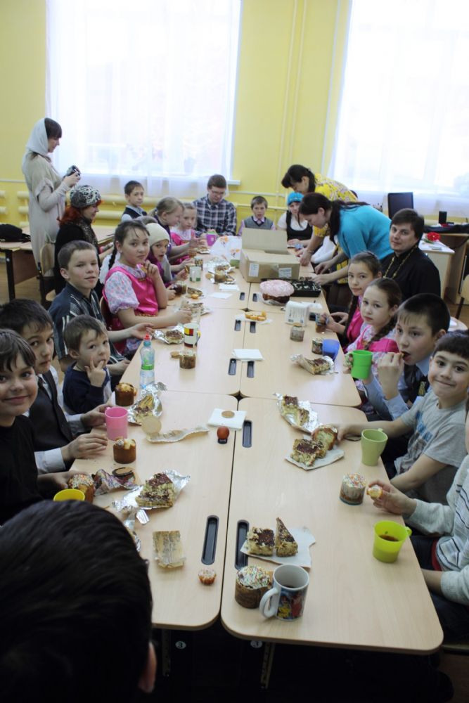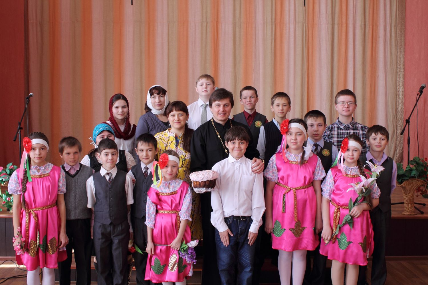 Ребята исполнили музыкально-литературную композицию «Нам поет пасхальный звон о жизни вечной». После этого ребят поздравил со светлым праздником Пасхи иерей Алексий Евсеев. Много добрых, радостных пожеланий услышали ребята от батюшки. В конце праздника был традиционный сладкий стол и подарки для детей.