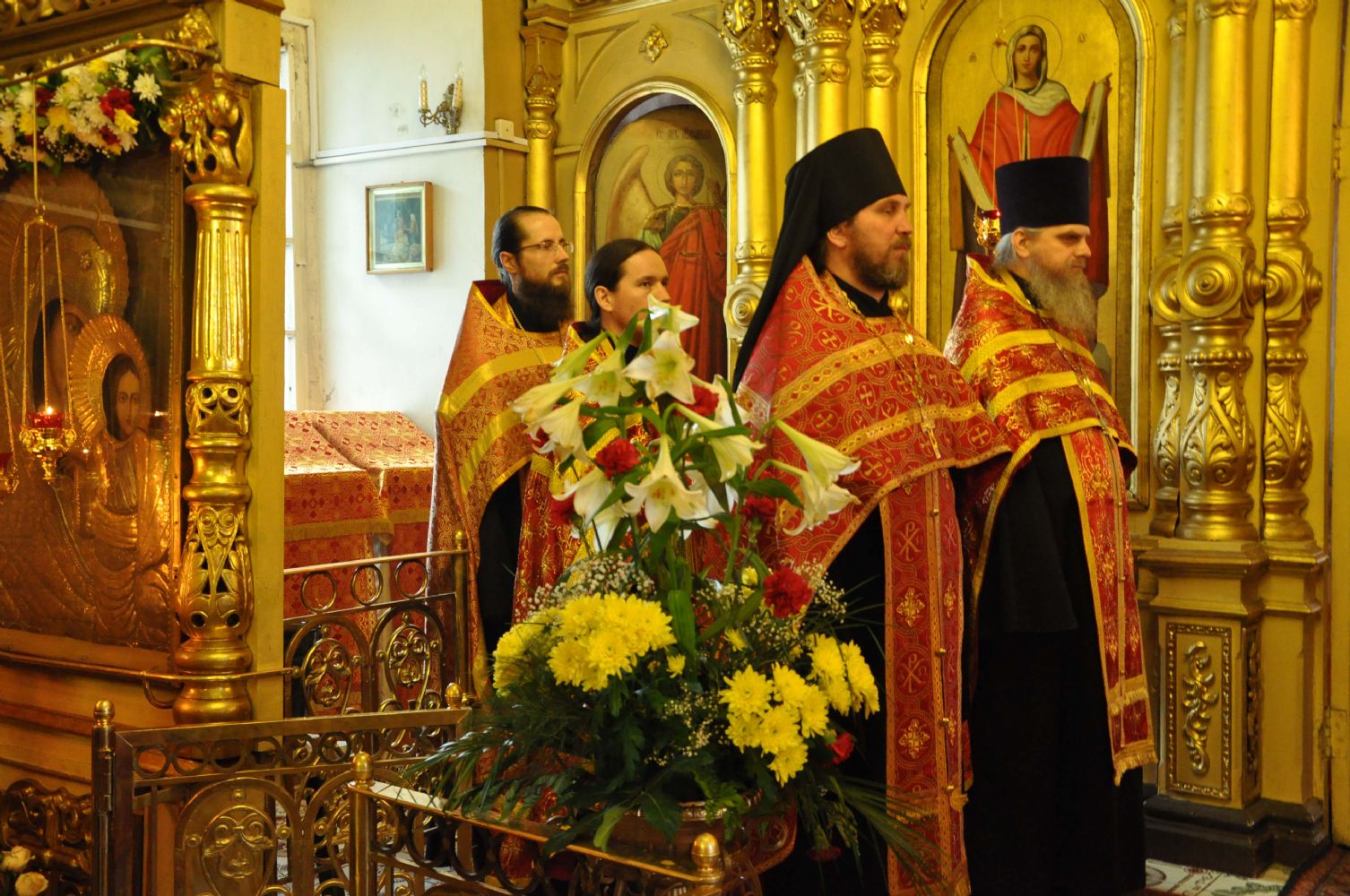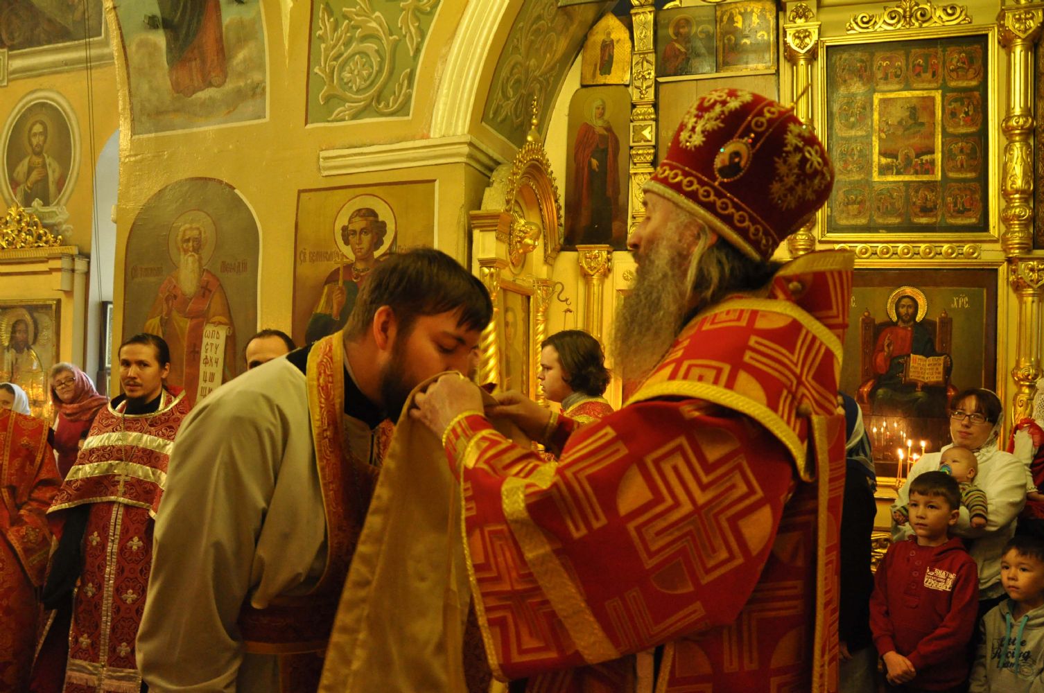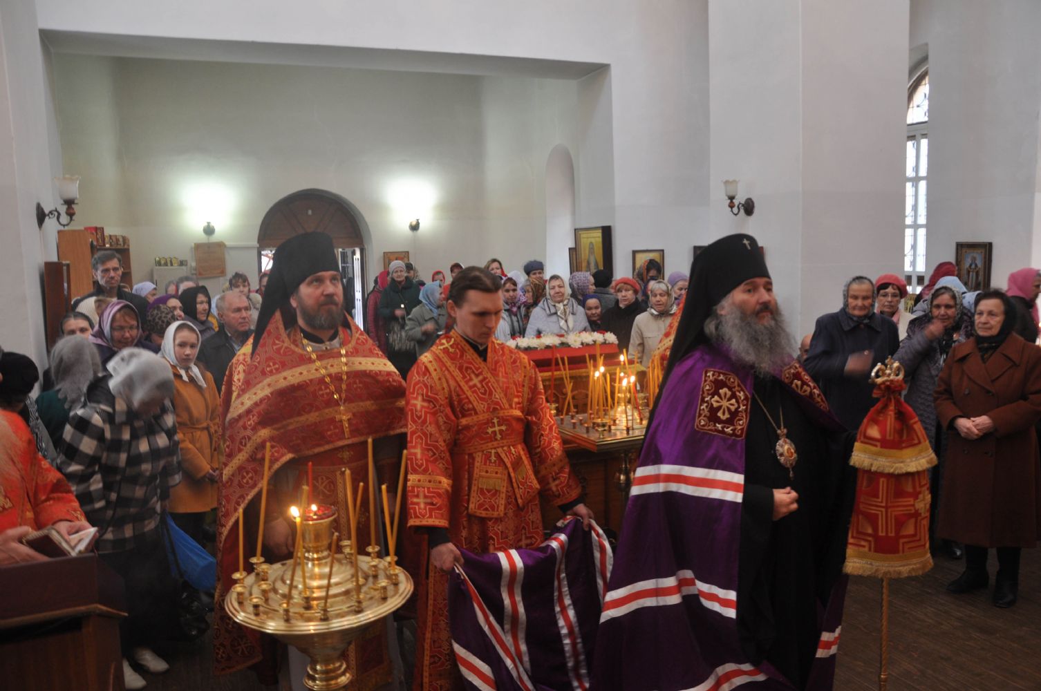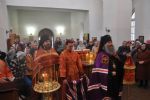 Владыке сослужили благочинный Волжского церковного округа, настоятель храма митрофорный протоиерей Александр Михайлов, клирик храма в честь Успения Божией Матери г. Йошкар-Олы иеромонах Серафим (Пасанаев), настоятель Свято-Троицкого храма с. Помары священник Сергий Петров и клирик Никольского собора г. Волжска священник Алексий Скрябин.