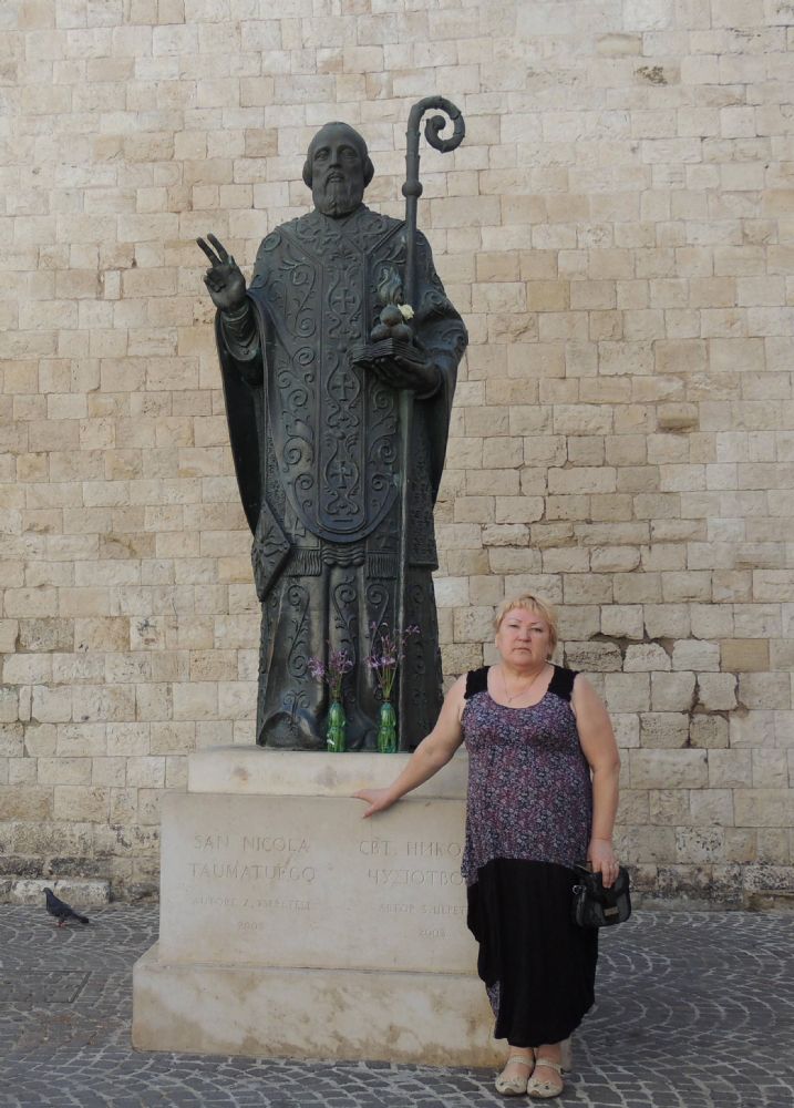 19 мая, получив благословение нашего Владыки, Архиепископа Иоанна, наша делегация, состоящая из священнослужителей и сотрудников Йошкар-Олинской и Марийской епархии, на автобусе выехала в Москву. Во Внуково прибыли группы из других митрополий и епархий. Зарегистрировавшись, мы вылетели в Бари. Волнение не покидало нас: для многих из нас это была первая поездка в Базилику Святого Николая, в которой почивают мироточивые мощи великого угодника Божия, и тысячи паломников со всего света стремятся приложиться к святым реликвиям. В 10.00 утра местного времени мы прибыли в аэропорт Palese. Пройдя таможню, на автобусе мы направились в гостиницу Palace. По дороге экскурсовод знакомила нас с историей города.