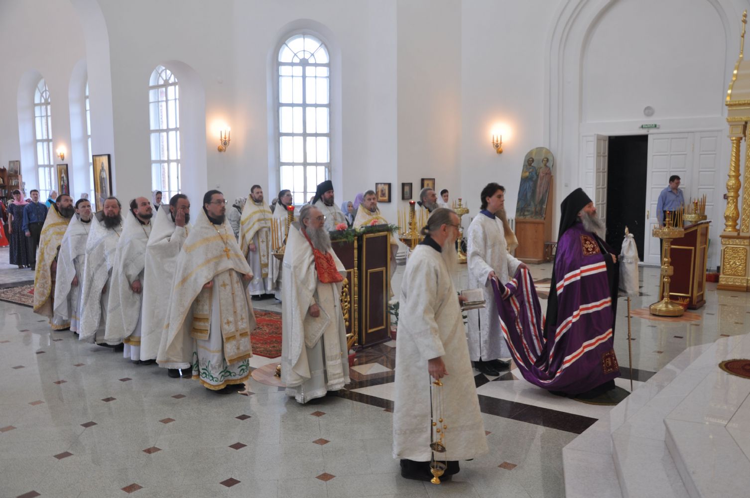 Его Высокопреосвященству сослужили: благочинный Йошкар-Олинского церковного округа, настоятель Вознесенского кафедрального собора митрофорный протоиерей Евгений Кутырев, настоятель храма в честь иконы Божией Матери «Державная» п. Медведево протоиерей Алексий Михайлов, благочинный Пригородного церковного округа, настоятель храма в честь иконы Божией Матери «Казанская» с. Нурма священник Александр Коваль, настоятель храма в честь Архангела Михаила с. Новая Слобода протоиерей Андрей Малюта, настоятель храма Покрова Пресвятой Богородицы с. Чкарино протоиерей Валентин Пылаев, настоятель храма в честь святых бессребреников Космы и Дамиана с. Орша протоиерей Сергий Мошкин, настоятель храма в честь Всех святых в земле Российской просиявших п. Советский протоиерей Николай Ярошевич, настоятель храма в честь Сретения Господня с. Азаново протоиерей Николай Егошин, клирик Успенского храма г. Йошкар-Олы иеромонах Серафим (Пасанаев), клирик Вознесенского кафедрального собора г. Йошкар-Олы священник Александр Козлов, настоятель храма в честь иконы Божией Матери «Владимирская» с. Кузнецово священник Василий Яшмолкин, настоятель храма в честь Вознесения Господня с. Пертнуры священник Евгений шатров и клирик храма священник Алексий Добиков.