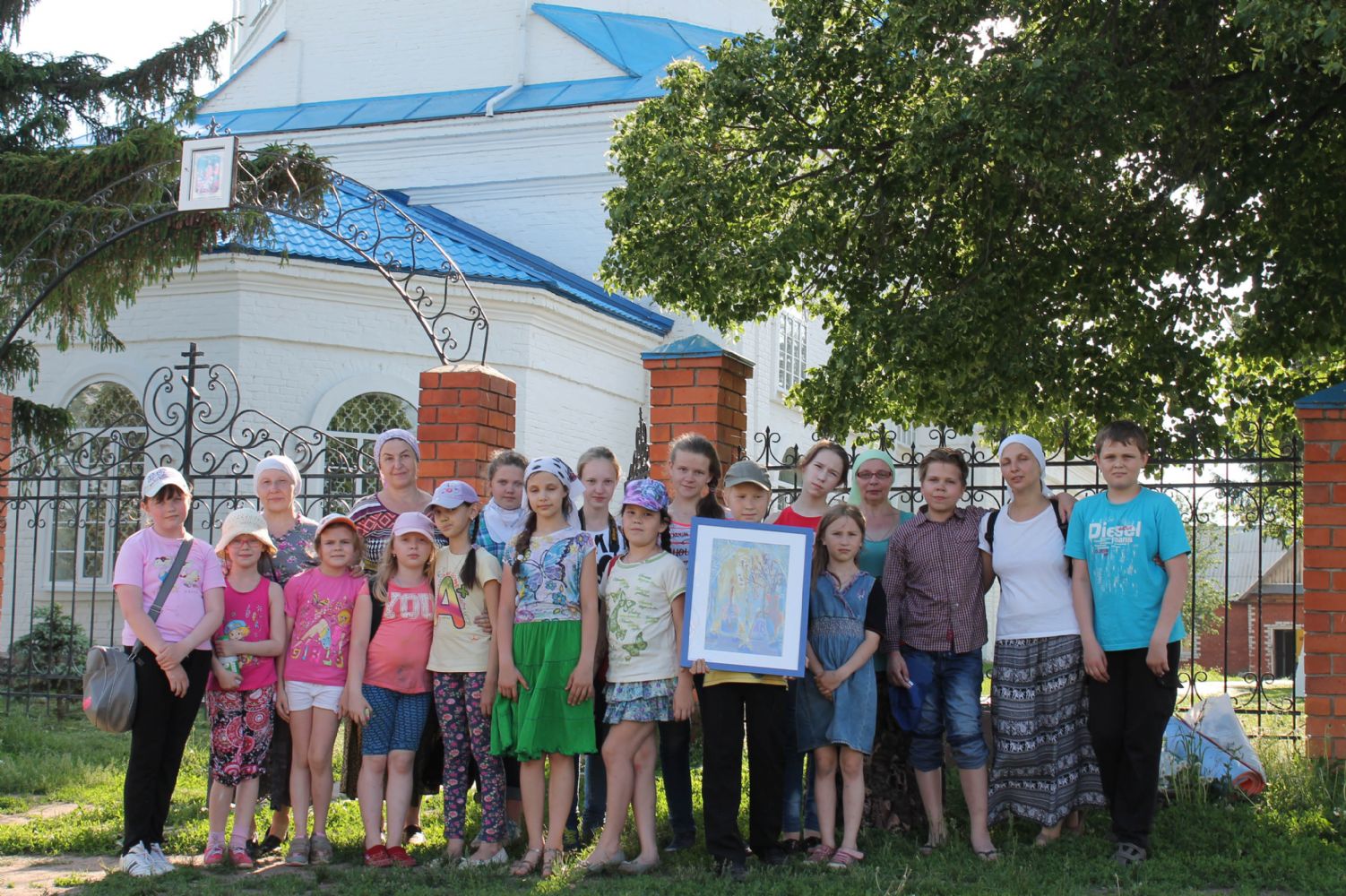 Перед отъездом участники поездки сфотографировались на память. В знак благодарности на молитвенную память архимандриту Иоанну были переданы две картины, выполненные одним из воспитанников изостудии.