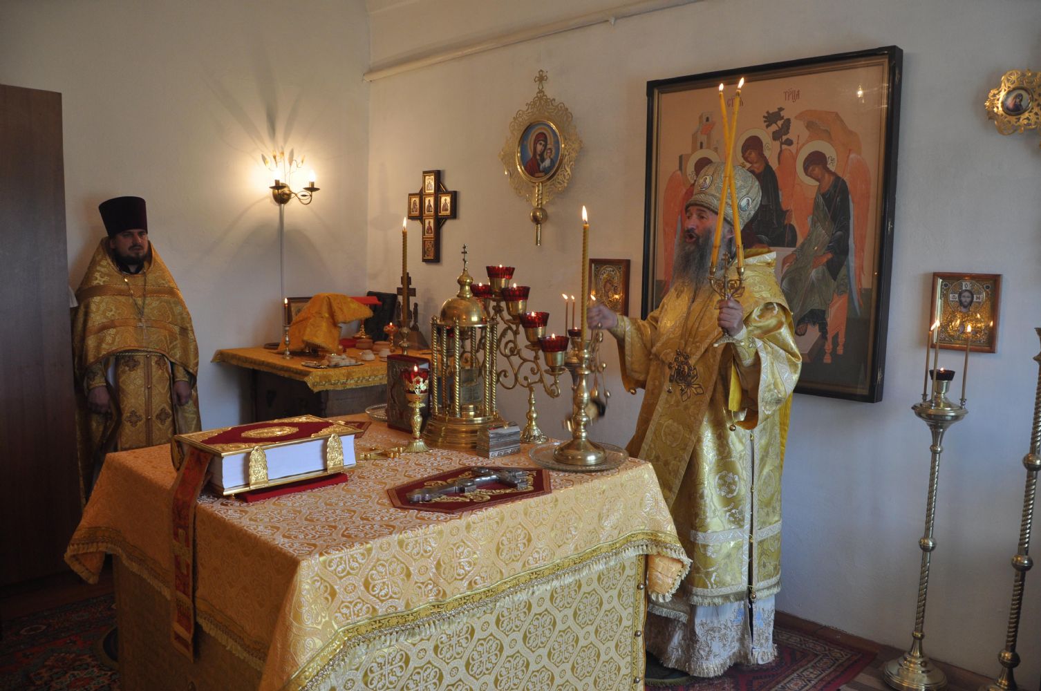 Владыке сослужили благочинный Пригородного церковного округа, священник Александр Коваль и настоятель Свято-Троицкого храма с. Красный Яр священник Михаил Репин.