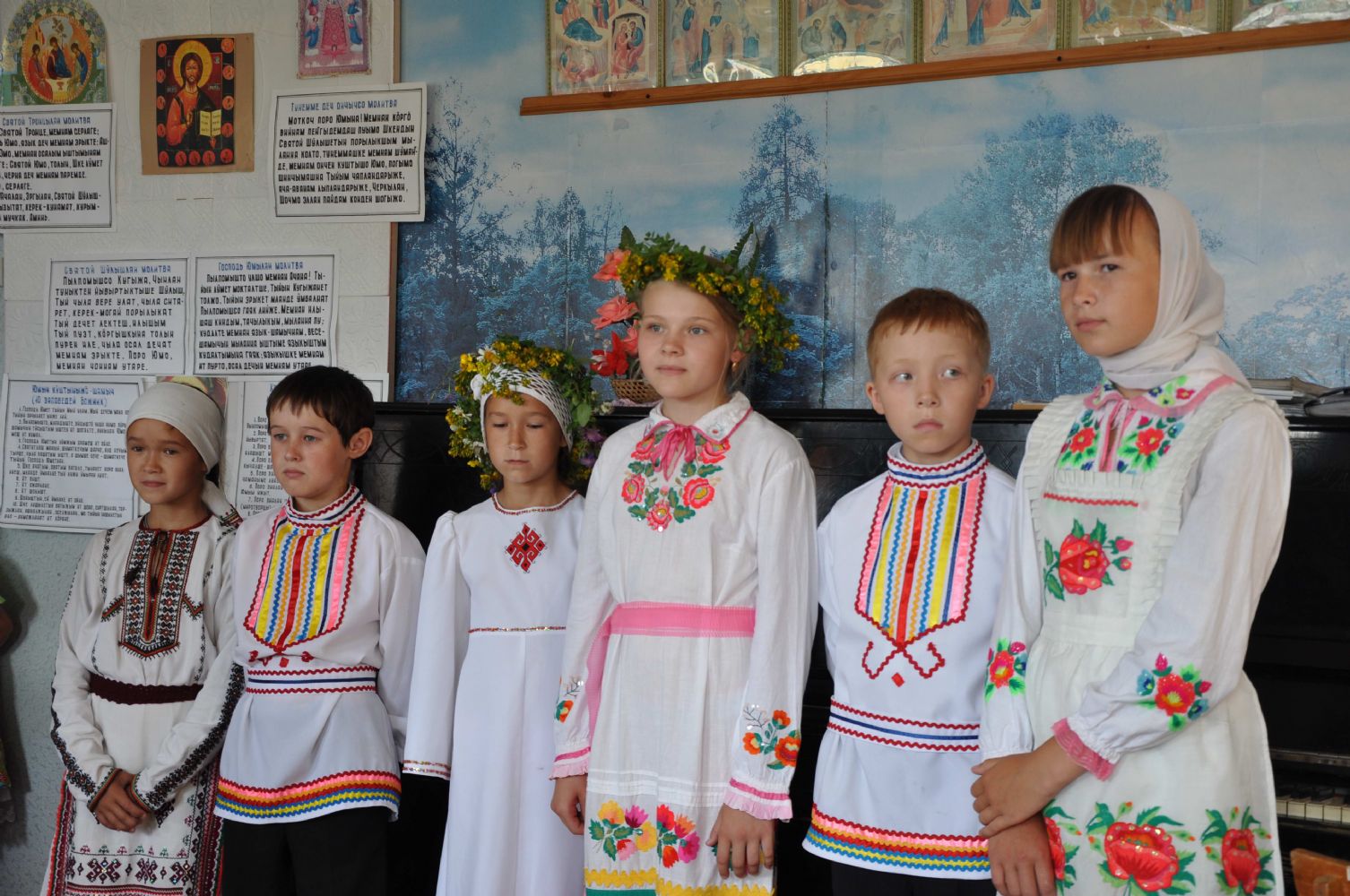 На трапезе перед Владыкой, священниками и гостями выступили дети из воскресной школы с. Арино. Ребята исполнили художественные номера на марийском языке.