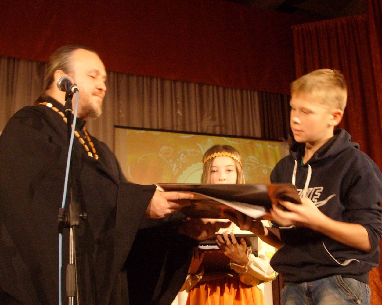 Батюшка вручил грамоты и иконки авторам лучших работ по итогам конкурса сочинений, посвященных князю Владимиру, — Сергею Багаеву, Наташе и Маше Рыбаковым из Оршанки. Отмечена и работа Ольги Ложкиной из Лужбеляка.