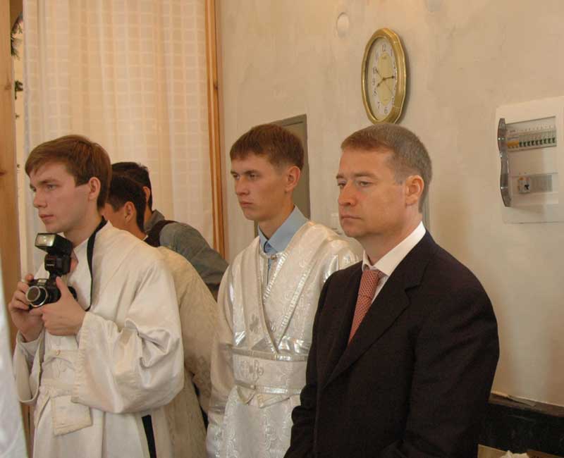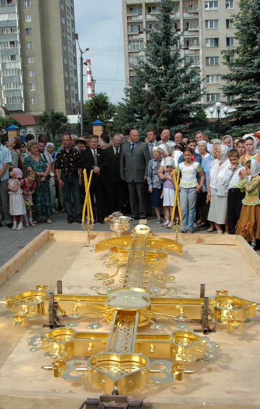 А в одну из недавних августовских суббот собравшиеся на территории вновь построенного храма стали свидетелями удивительно красочного и трогательного явления: подъема и установки на куполе 180-килограммового позолоченного креста. После его освещения, специальная бригада высотников производственно-художественного объединения «Ренессанс» из города Дзержинска приступила к сложнейшей работе. Крест закрепили на лебедке и начали медленно поднимать. Собравшиеся с замиранием сердца и молитвой на губах наблюдали изумительную картину: в лучах яркого солнца трос почти не виден и создается впечатление, что тяжелый позолоченный крест как бы сам мелкими шажками поднимается на купол. И когда, наконец, он уверенно встает на свое место, раздается звон колоколов нового собора.