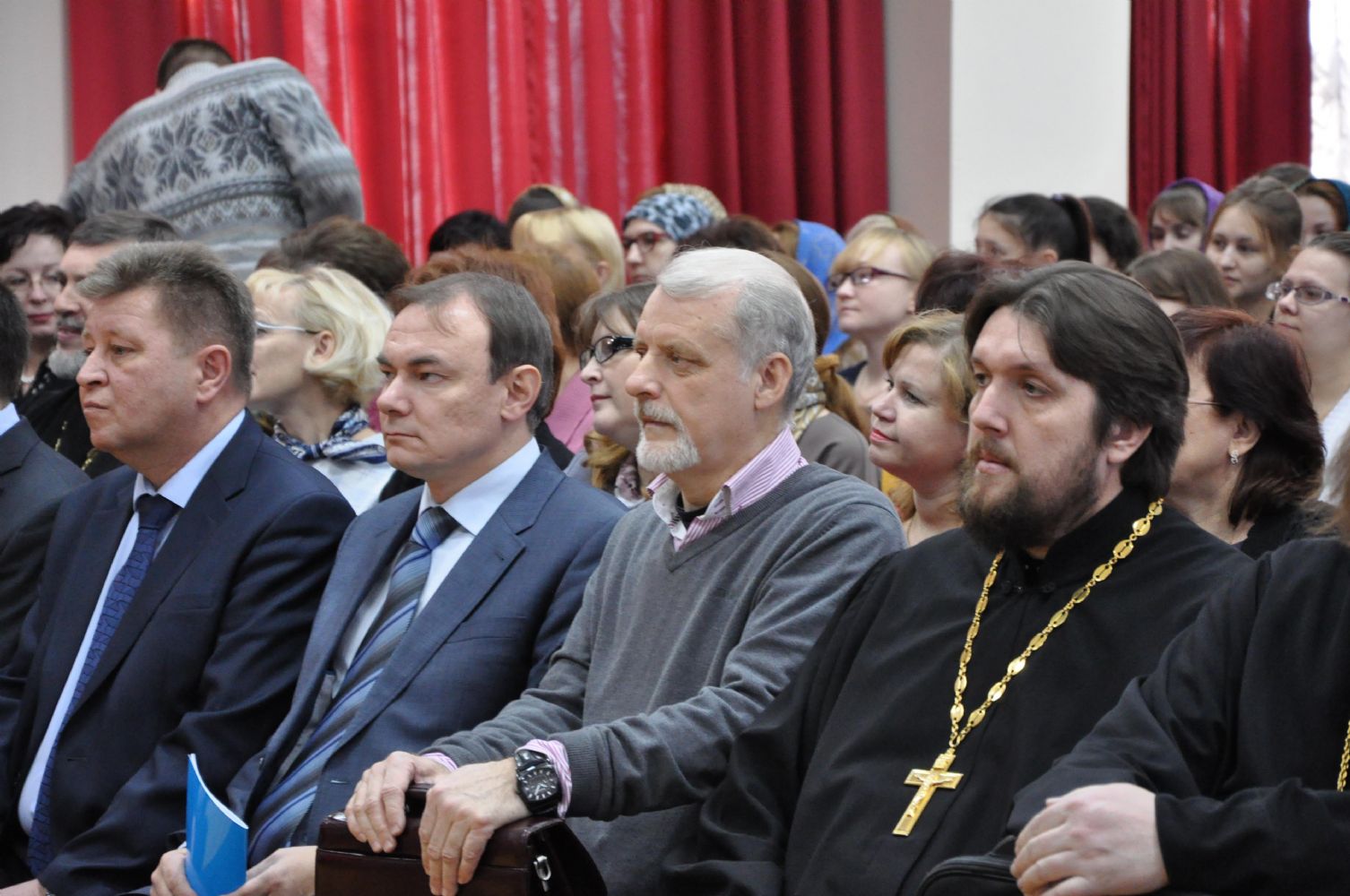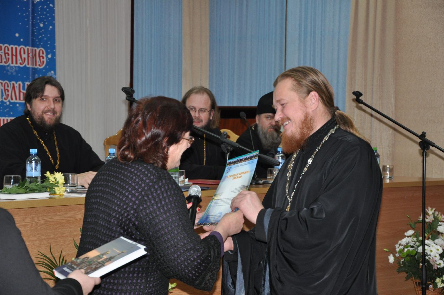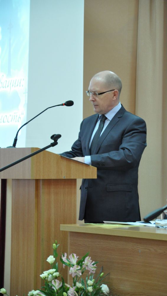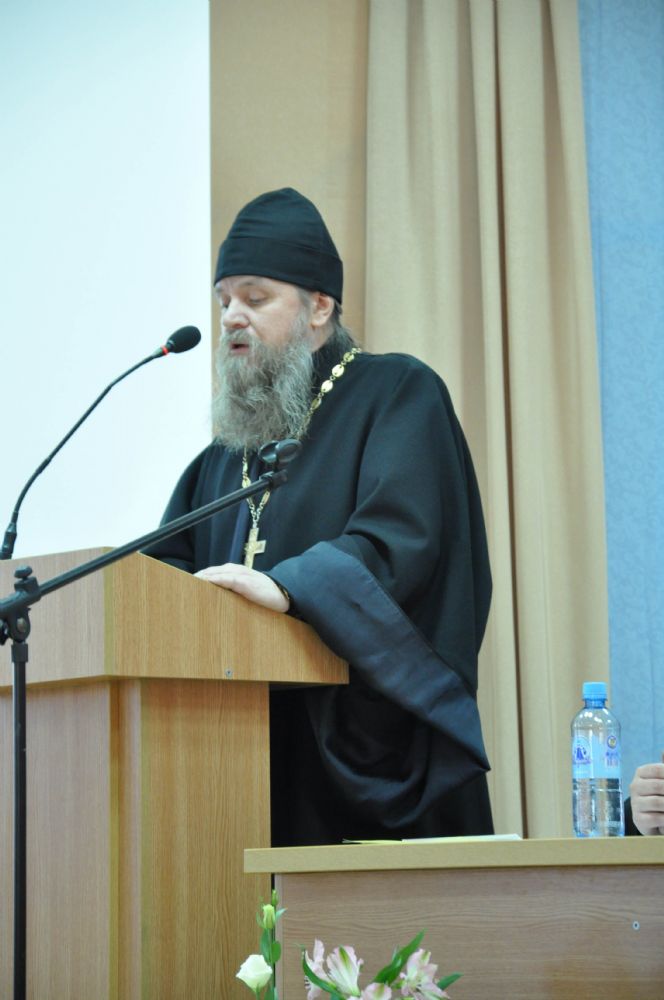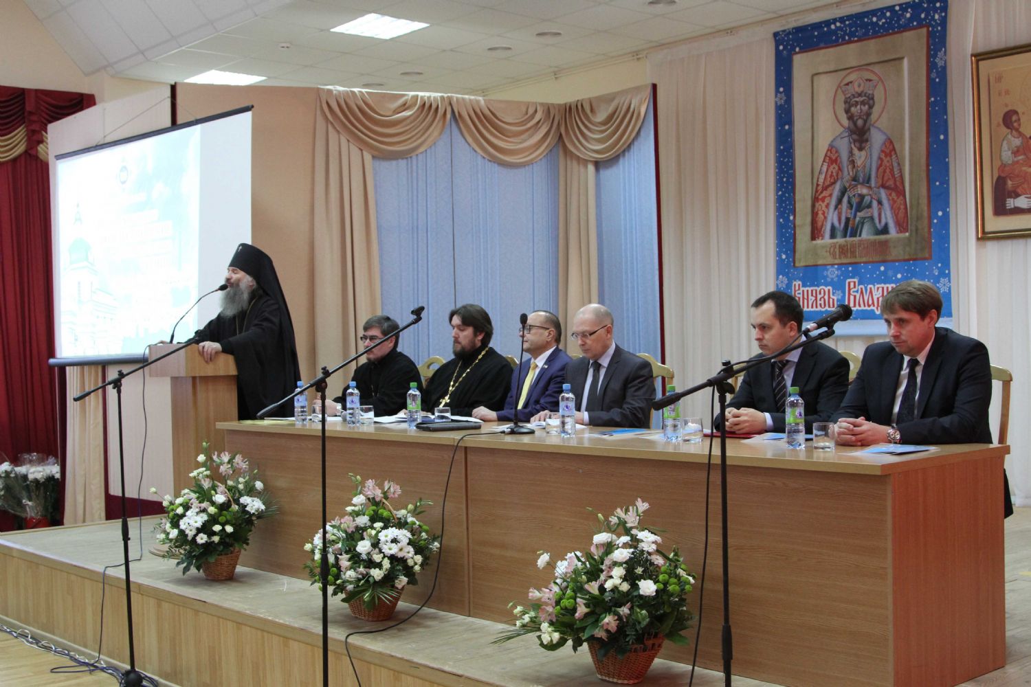 В президиуме: Его Высокопреосвященство архиепископ Йошкар-Олинский и Марийский Иоанн, министр культуры, печати и по делам национальностей Республики Марий Эл М.З. Васютин, ректор МарГУ М.Н. Швецов, временно исполняющий обязанности мэра г. Йошкар-Олы Е.В. Маслов, руководитель отдела образования и катехизации Йошкар-Олинского благочиния священник Александр Козлов, глава городского округа «Город Йошкар-Ола» А.Н. Принцев.