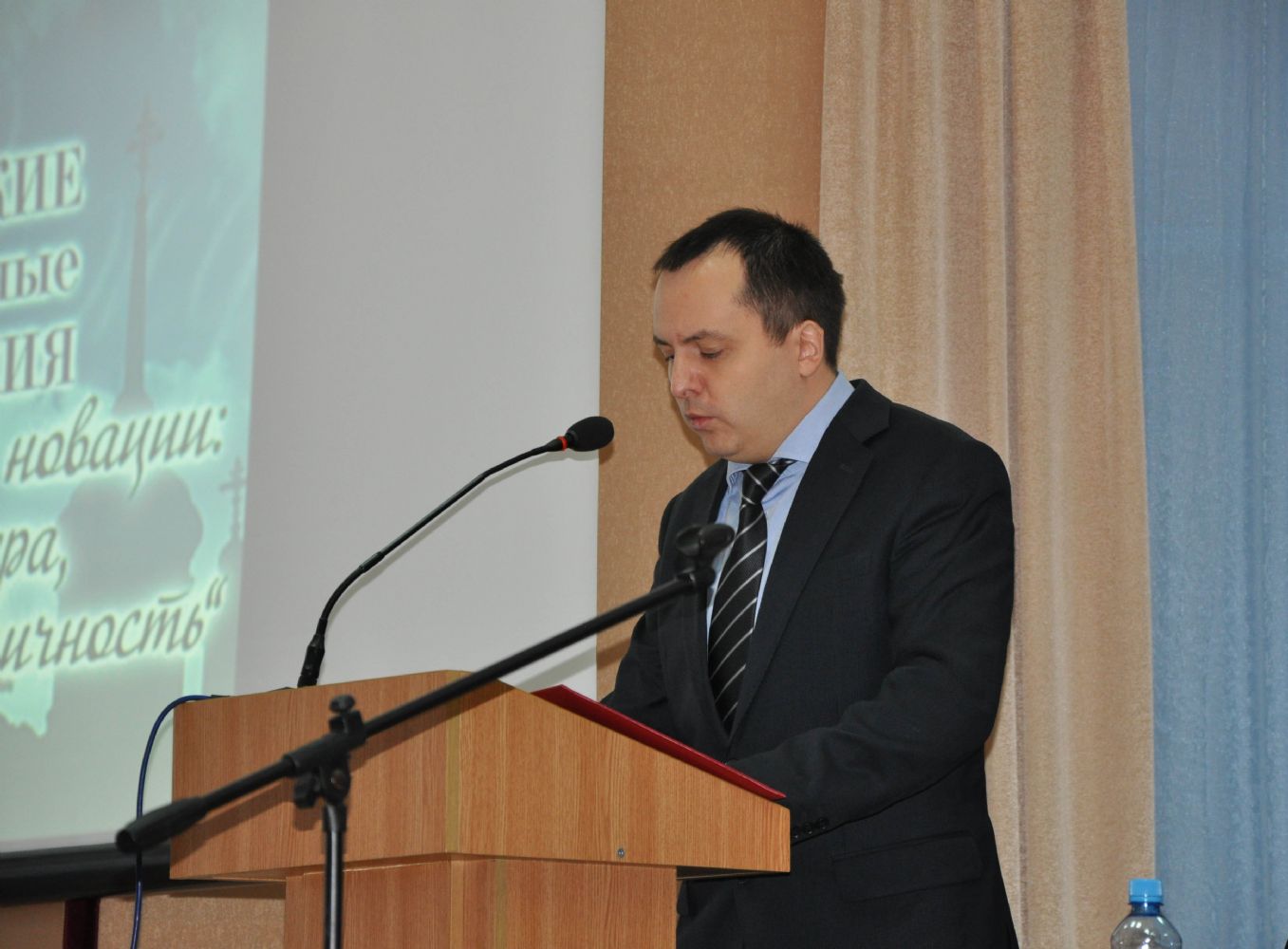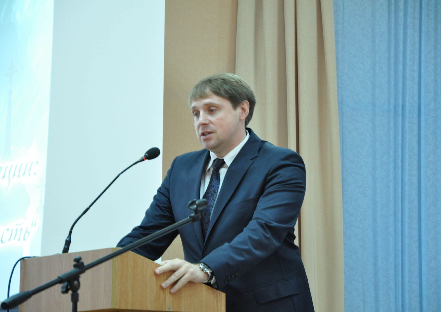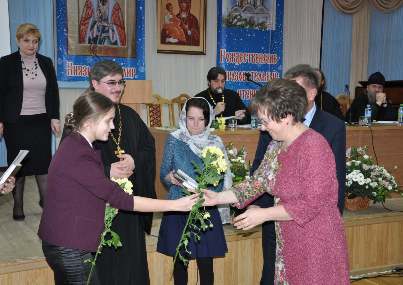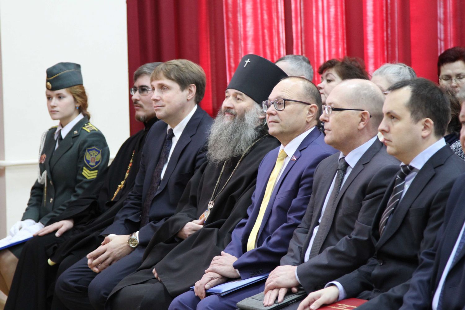 В президиуме: Его Высокопреосвященство архиепископ Йошкар-Олинский и Марийский Иоанн, министр культуры, печати и по делам национальностей Республики Марий Эл М.З. Васютин, ректор МарГУ М.Н. Швецов, временно исполняющий обязанности мэра г. Йошкар-Олы Е.В. Маслов, руководитель отдела образования и катехизации Йошкар-Олинского благочиния священник Александр Козлов, глава городского округа «Город Йошкар-Ола» А.Н. Принцев.