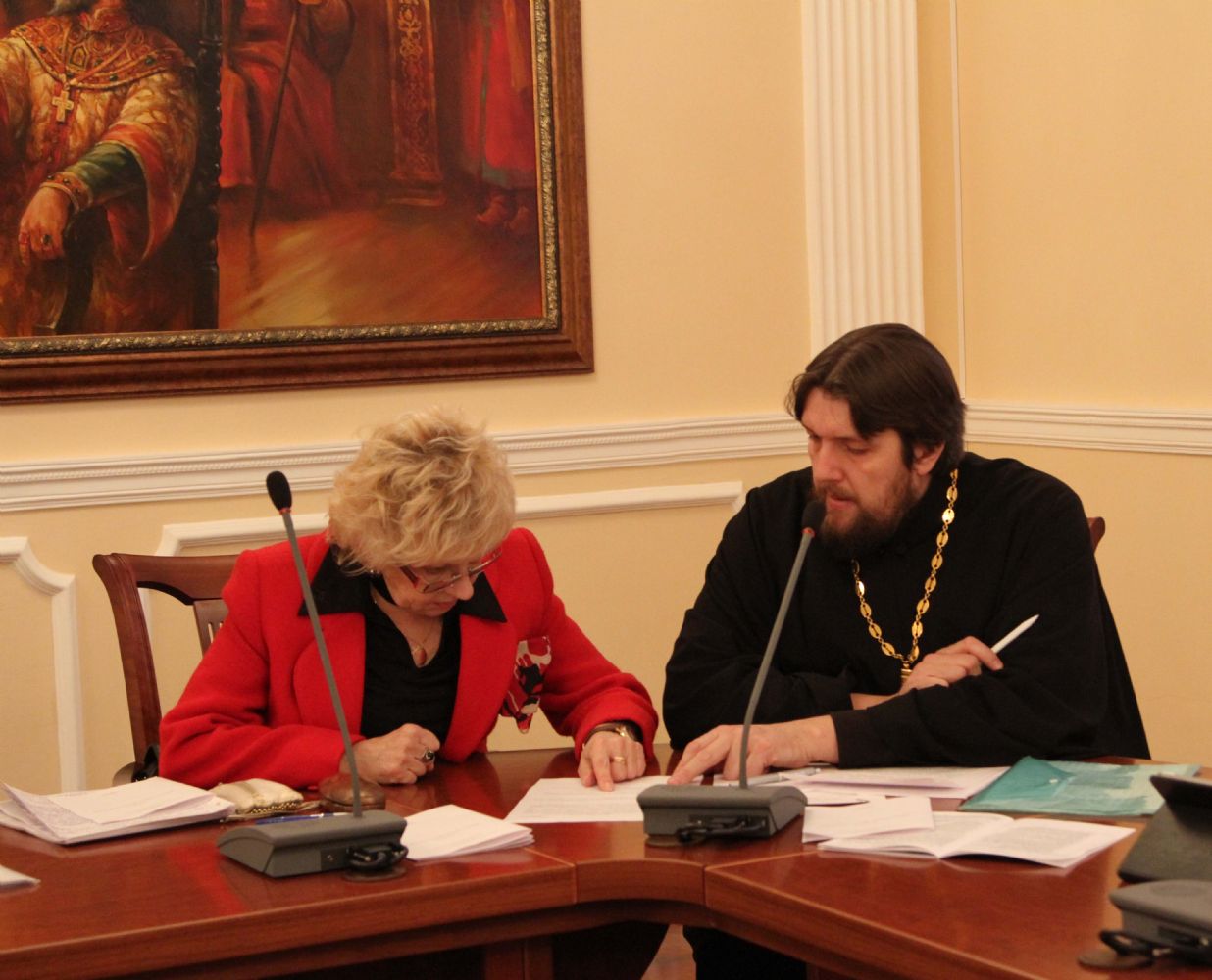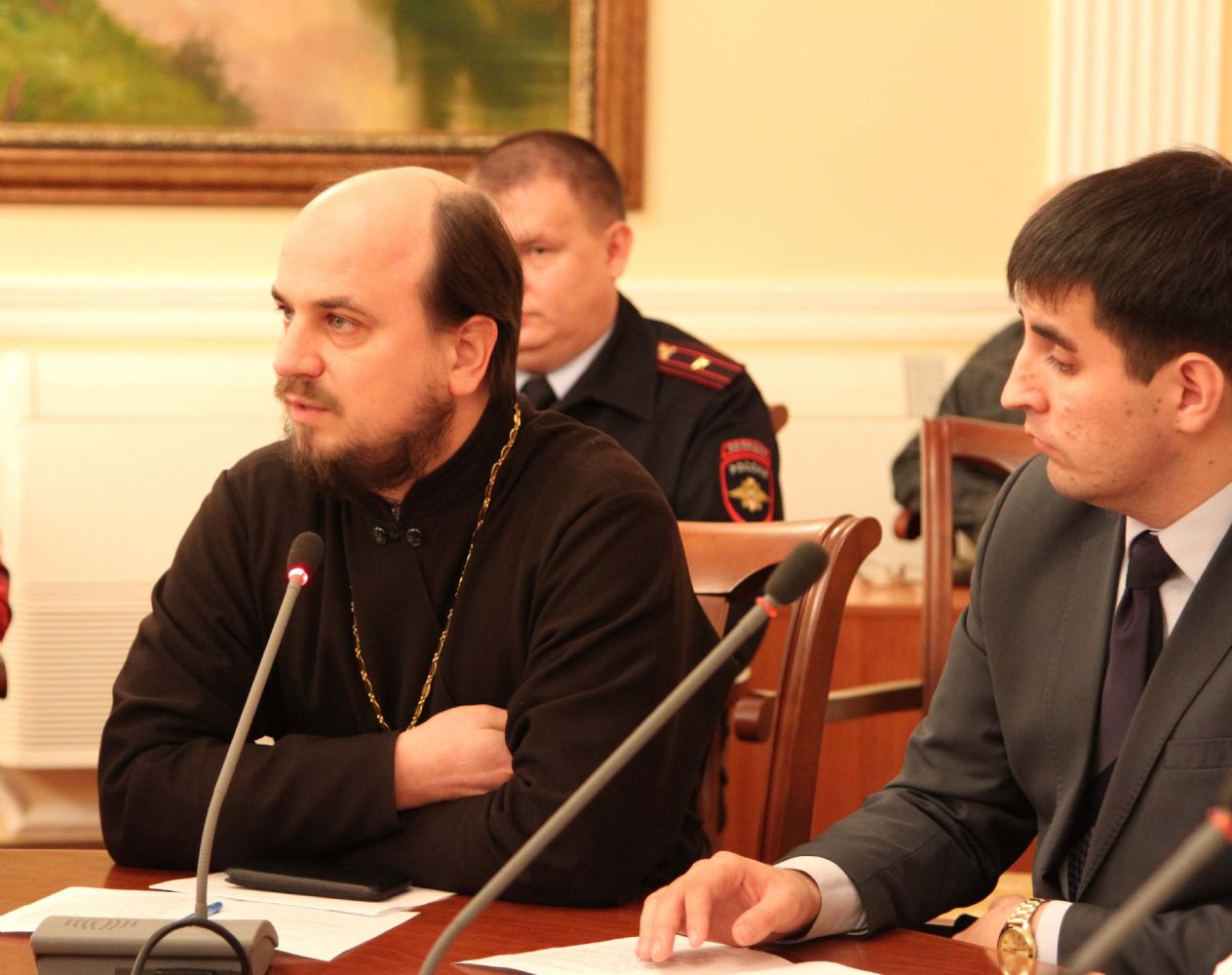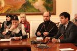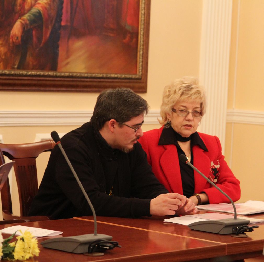 Первая тема, поднятая для обсуждения, звучала как: «Создание условий по сохранению духовного и культурного наследия». О соработничестве Церкви, Государства и общества в сохранении духовного и культурного наследия рассказал один из руководителей круглого стола иерей Андрей Норкин, ответственный в Епархии за взаимоотношения с Государством и обществом.