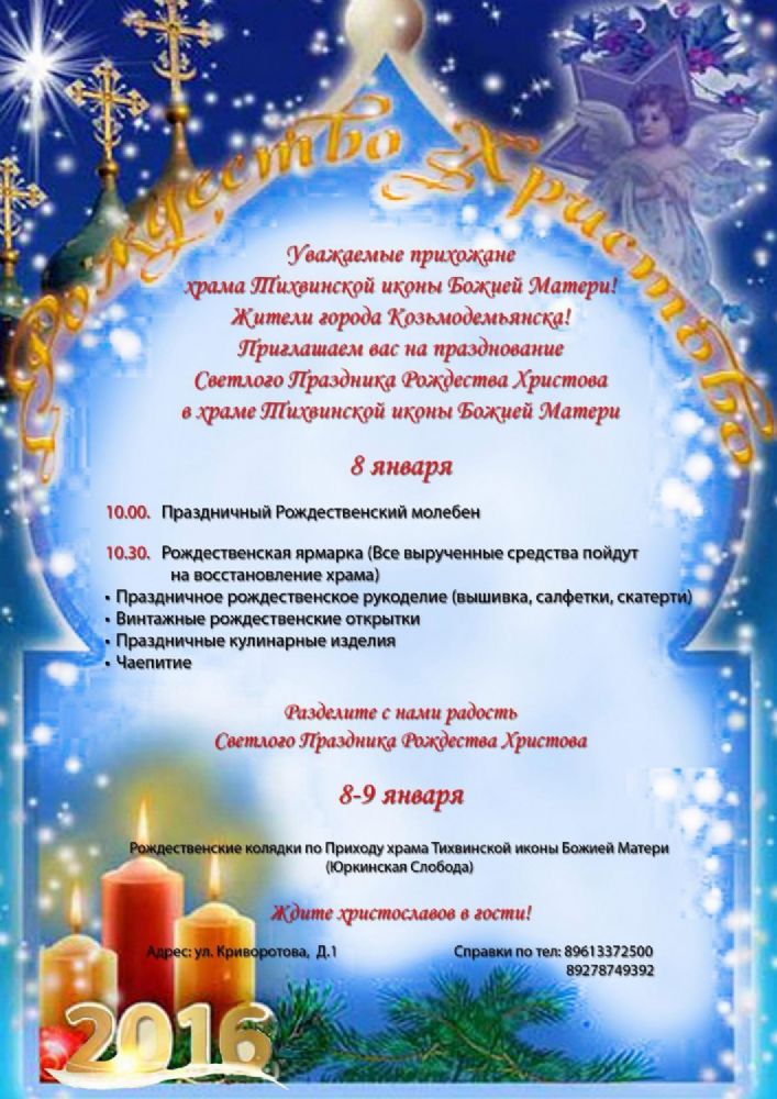 8 января в г. Козьмодемьянске в восстанавливающемся храме Тихвинской иконы Божией Матери прошел Рождественский молебен. Совершил молебен благочинный Горномарийского округа настоятель храма Святой Троицы иерей Алексий Сущев.