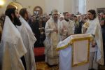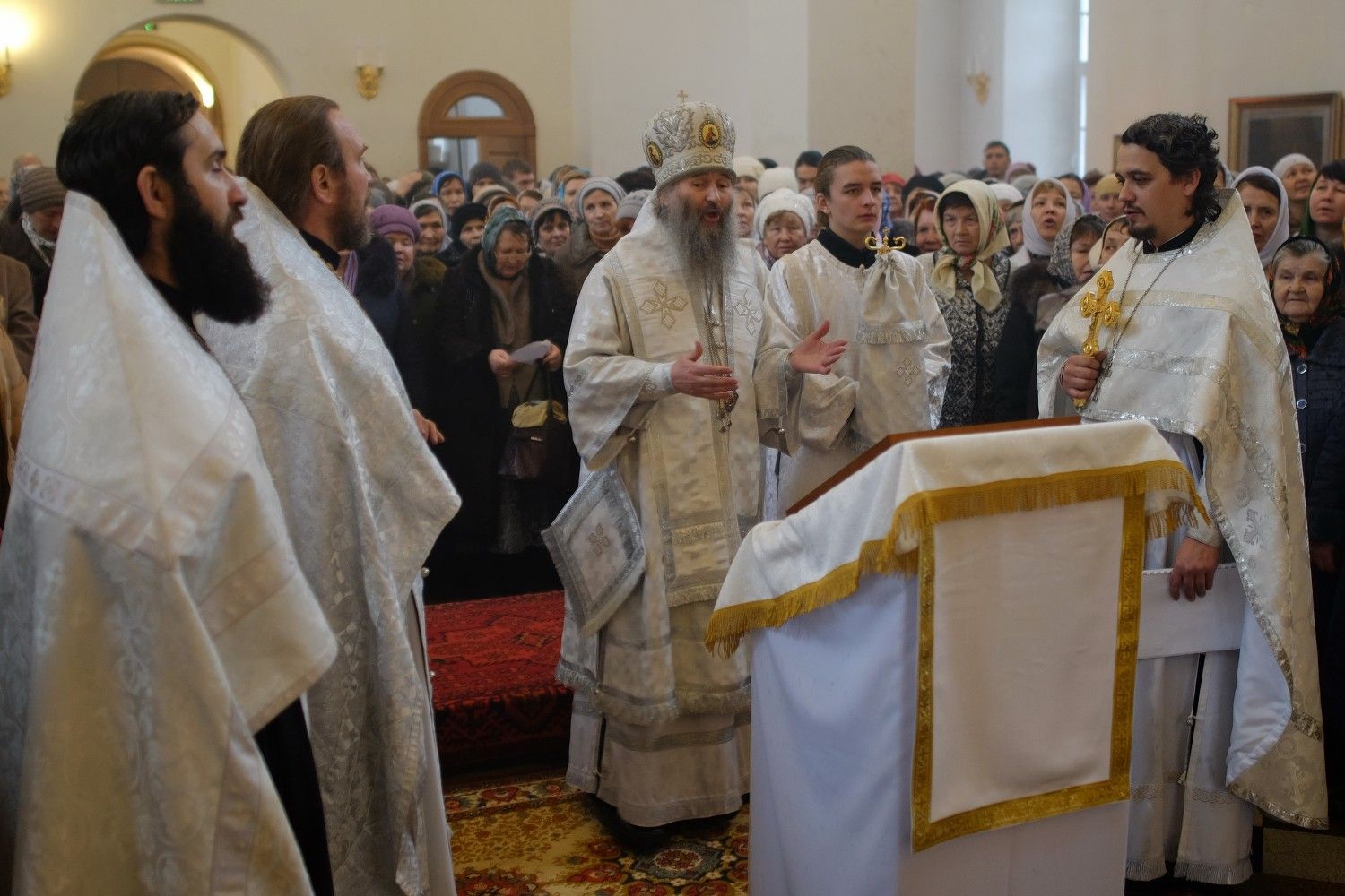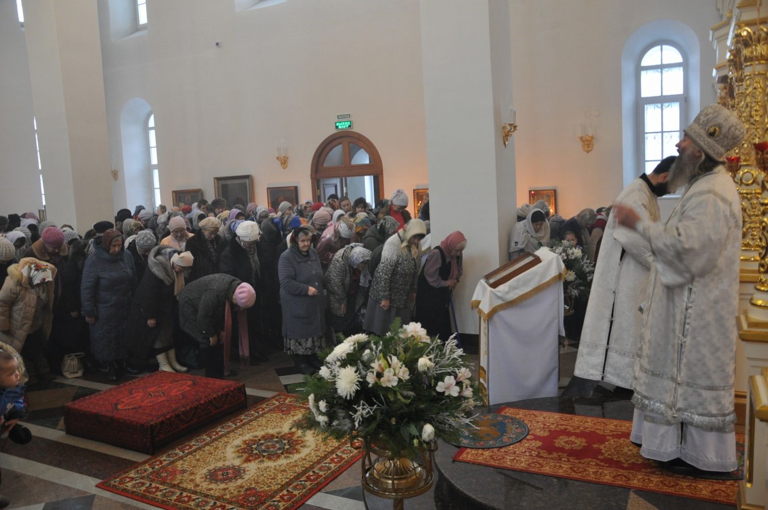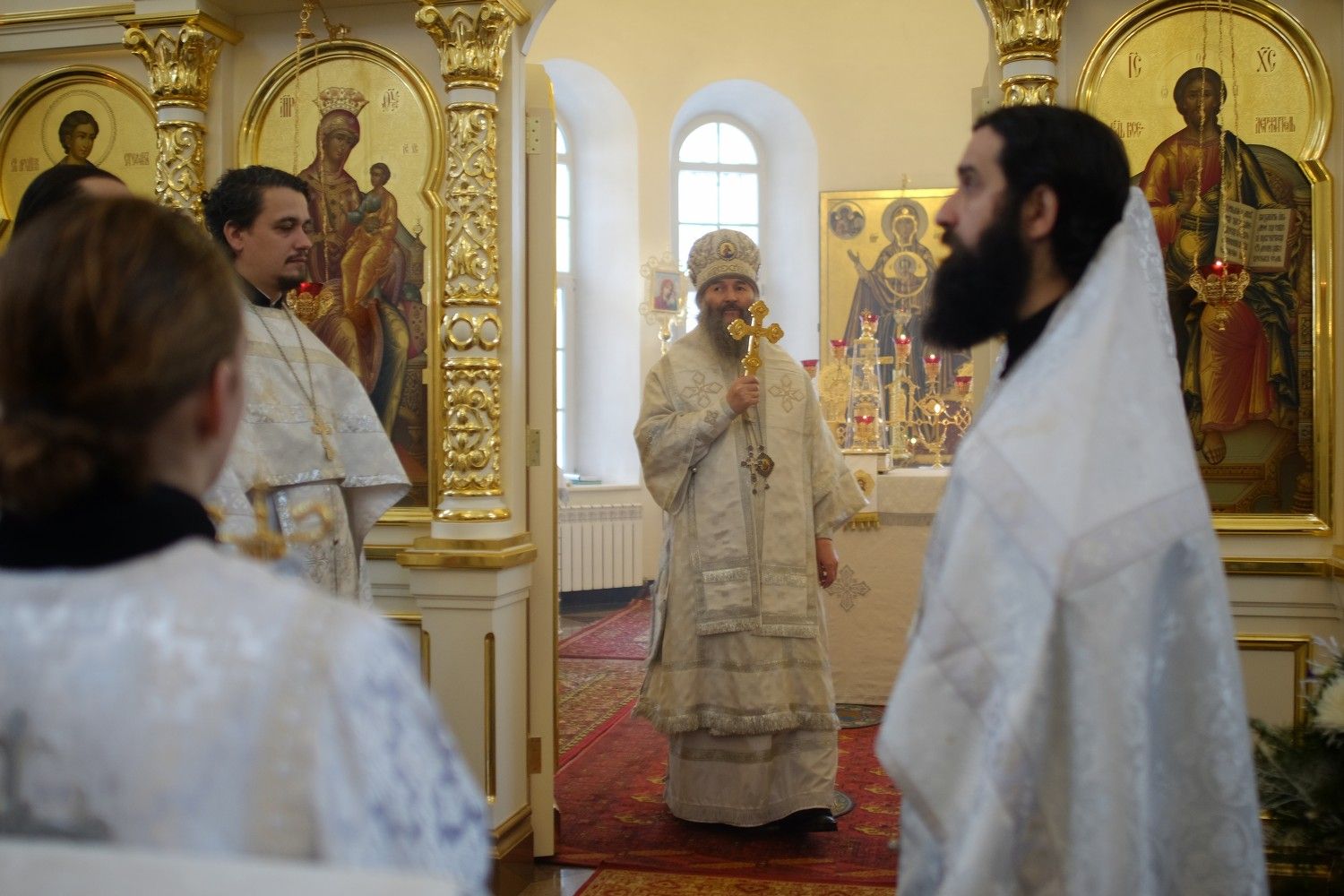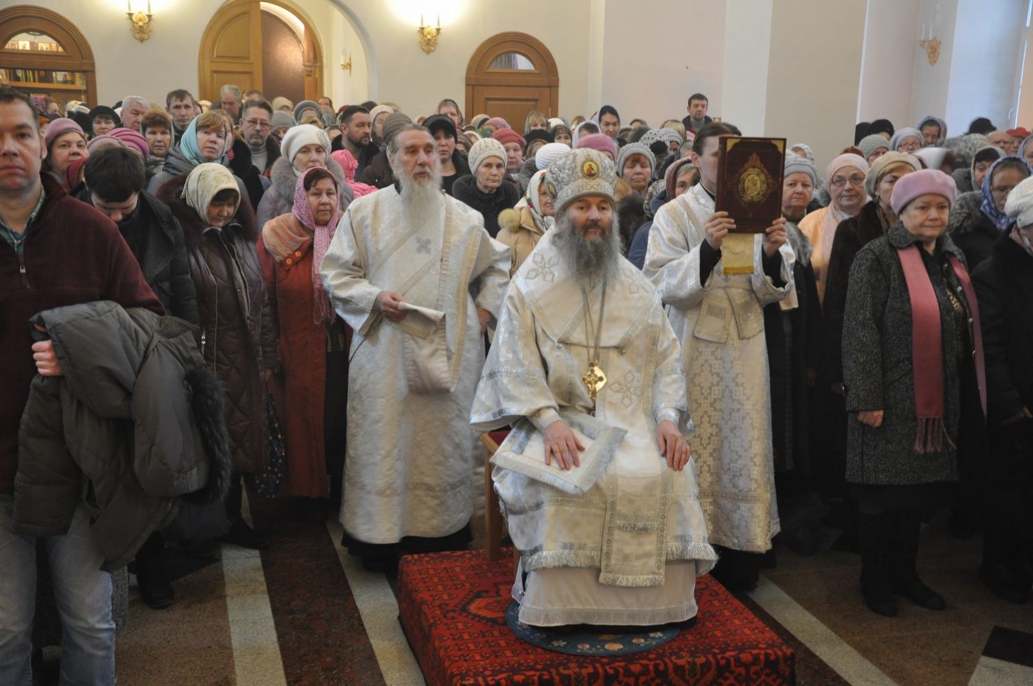 Владыке сослужили: секретарь Епархиального управления иеромонах Серафим (Пасанаев) и настоятель храма иерей Александр Лоскутов при стечении многочисленных прихожан. По окончании Литургии Владыка совершил чин великого освящения воды. В заключение было совершено славление празднику Крещения Господня.