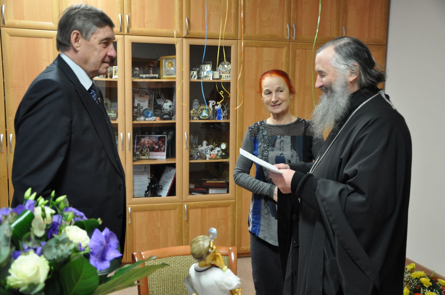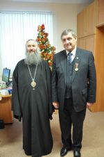 Его Высокопреосвященство архиепископ Йошкар-Олинский и Марийский Иоанн поздравил юбиляра с 70-летием и вручил Патриаршую награду.