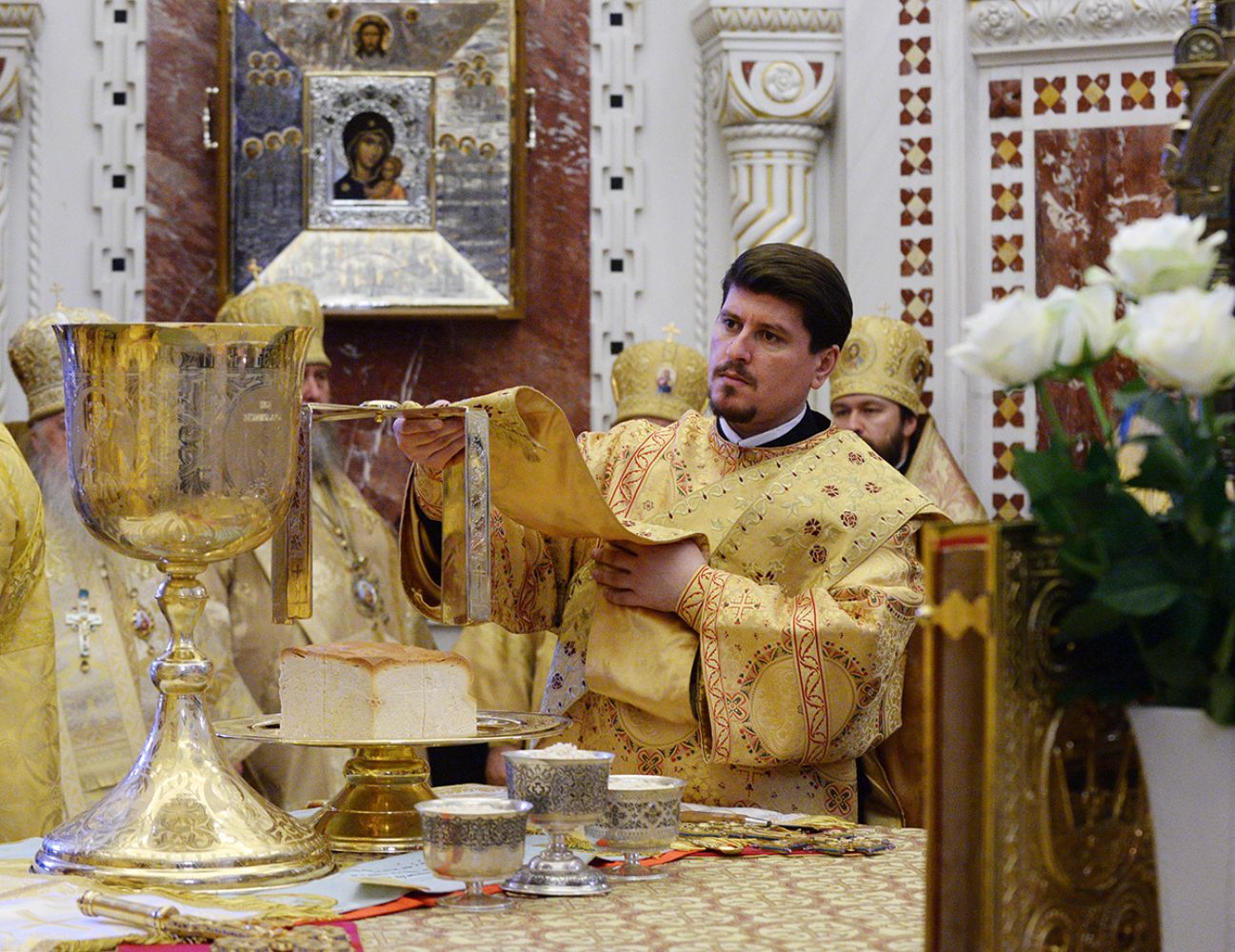 В сугубую ектению были включены особые прошения о ныне чествуемом Святейшем Патриархе Московском и всея Руси Кирилле. После сугубой ектении Предстоятель Русской Церкви вознес молитву о мире на Украине.