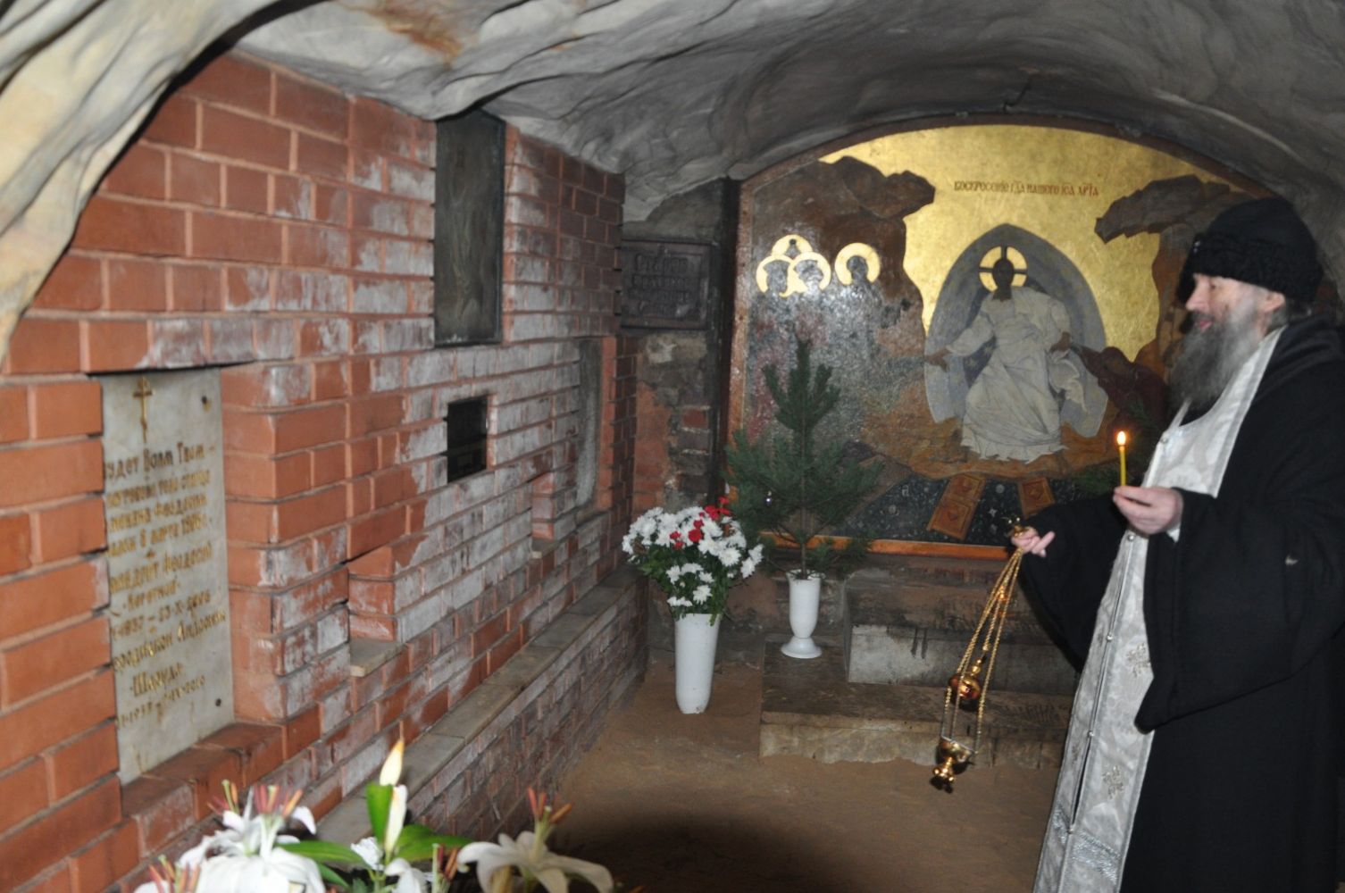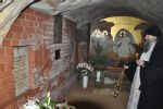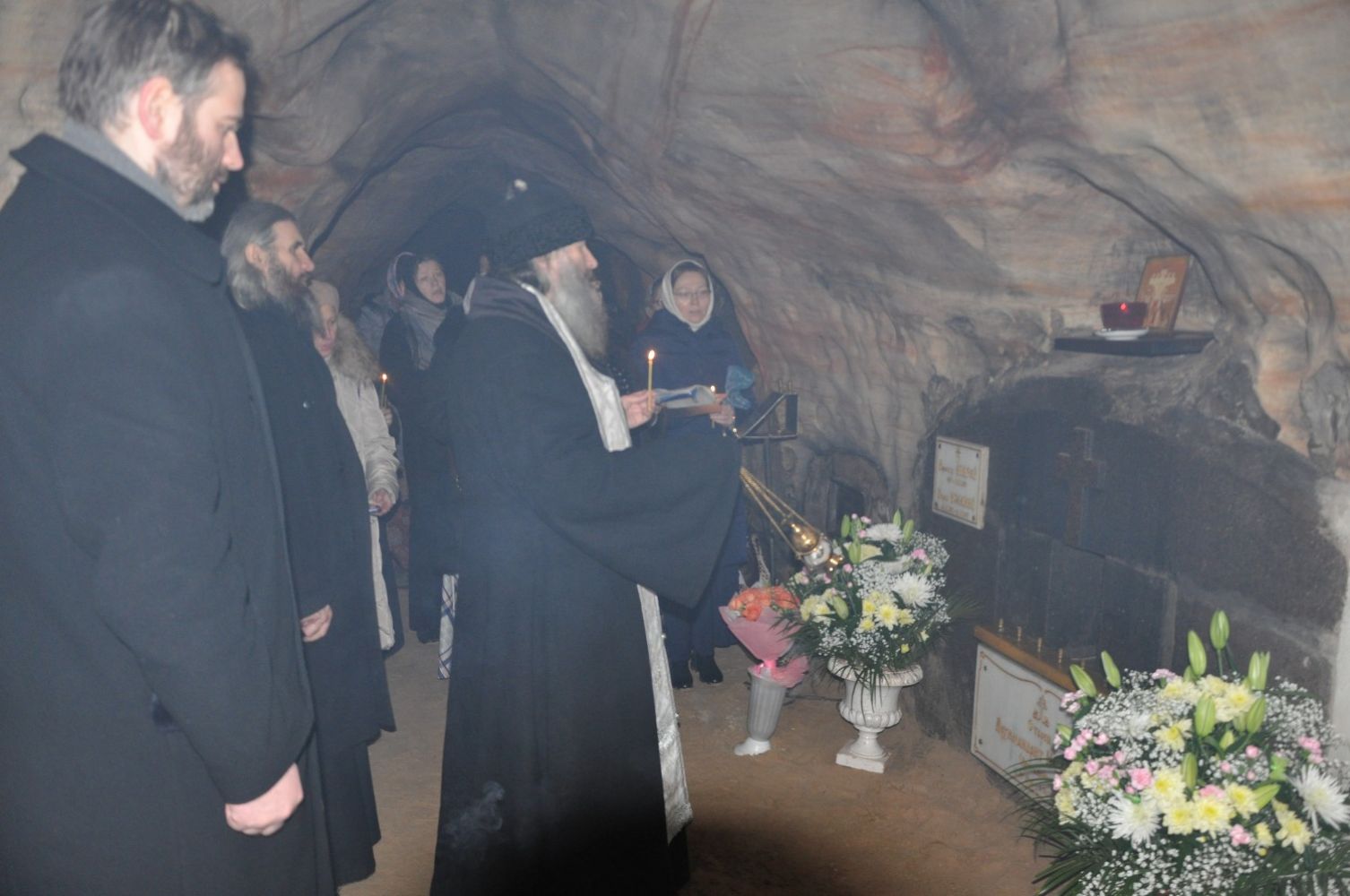 В заключении архиепископ Иоанн совершил заупокойную литию на месте упокоения отца Иоанна (Крестьянкина) в Богом зданных пещерах монастыря.