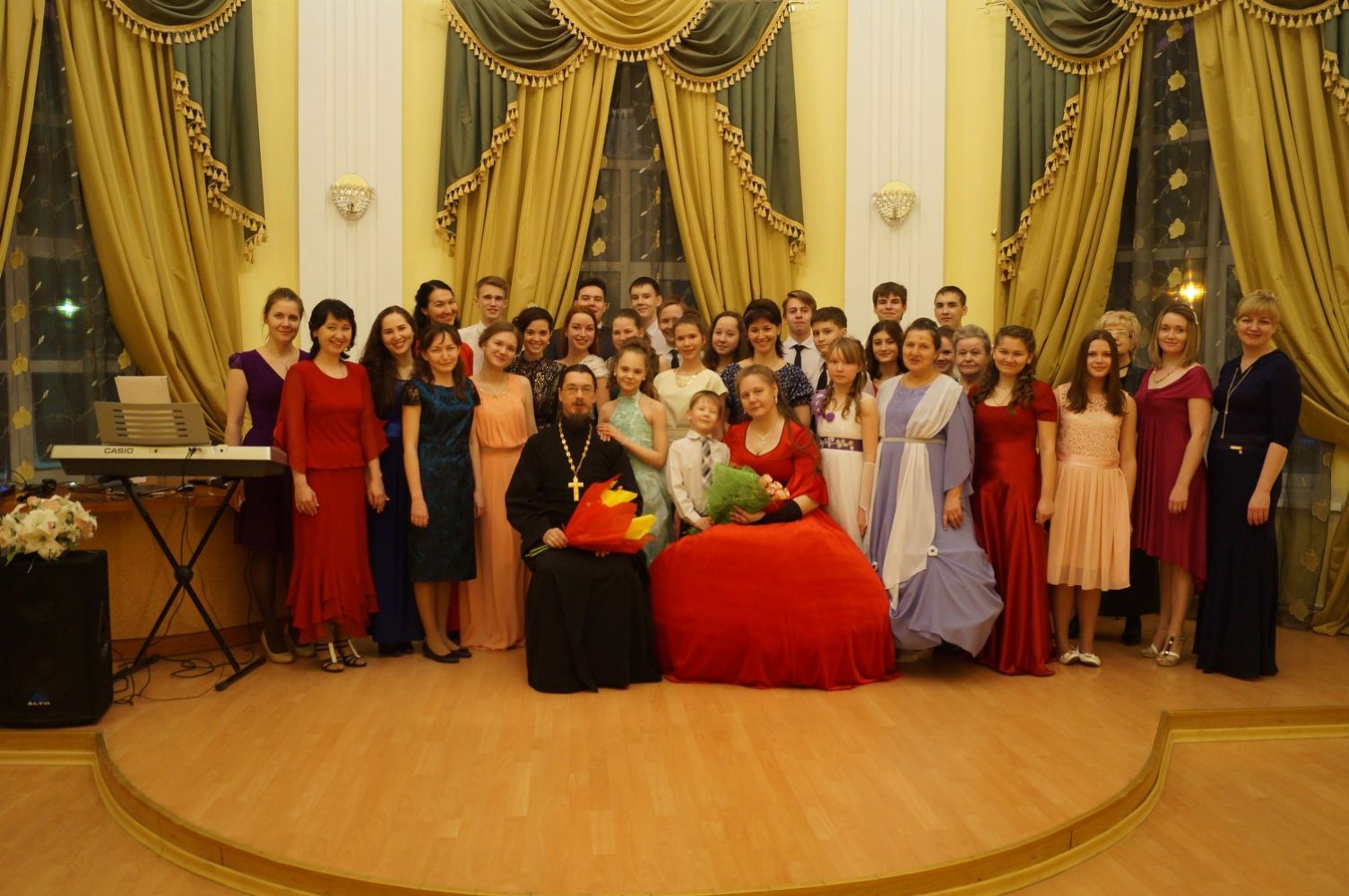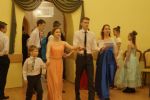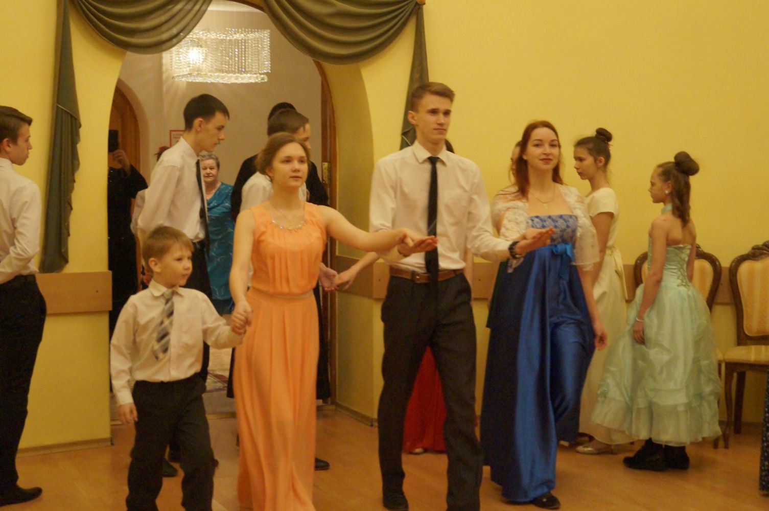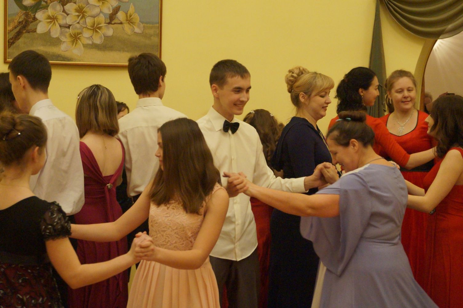 В начале бала под звуки полонеза 15 пар величественно поднялись по винтовой лестнице с зал, где отец Алексий поздравил всех с праздниками, а Ольга Юрьевна рассказала, как проводились балы в прошлые века. А дальше музыка закружила, понесла всех в танцующем водовороте. Тут чередовались официальный бранль, испанский вальс, шотландская полька, виргинская кадриль, бретонская строевая джига, ирландский кейли, полька-тройка и клумпакойц. В промежутках между танцами ребята Воскресной школы продемонстрировали свое музыкальное мастерство и порадовали присутствующих игрой на фортепиано, флейте, скрипке и гитаре.