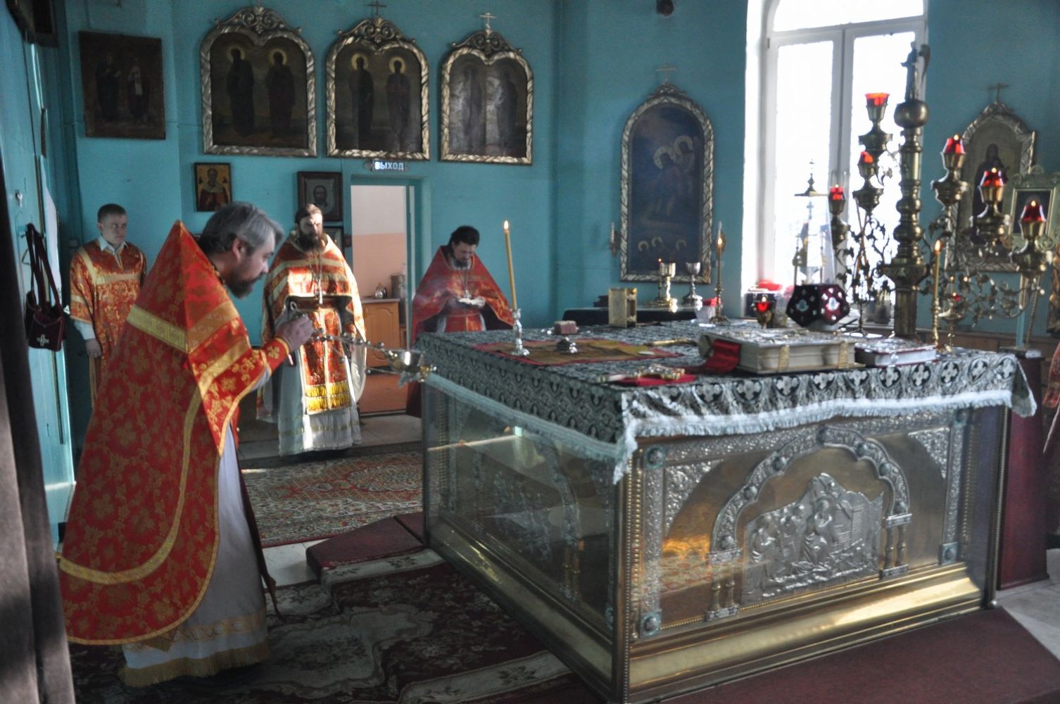 Владыке сослужили: настоятель храма иерей Виталий Михеев, настоятель храма Покрова Пресвятой Богородицы с. Алексеевское протоиерей Владимир Легач, клирики храма иерей Александр Усков и иерей Алексий Скрябин.Богослужебные песнопения исполнил хор Никольского собора под управлением регента Любови Михеевой.