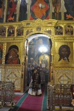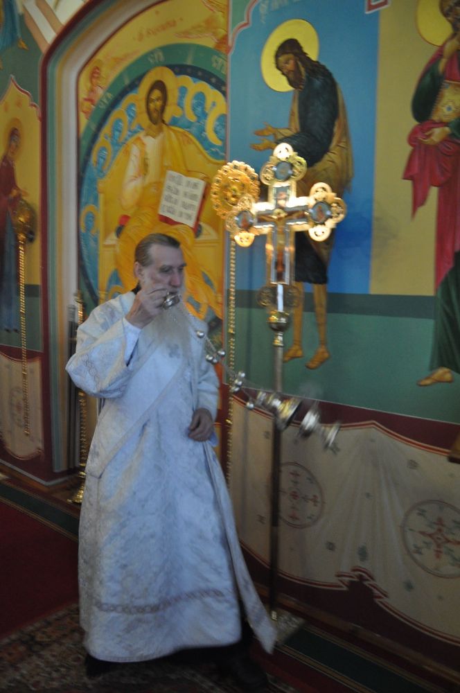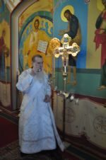 После великого славословия Его Высокопреосвященство совершил чин выноса Креста и после поклонения Кресту помазал елеем всех верующих, молившихся за богослужением.