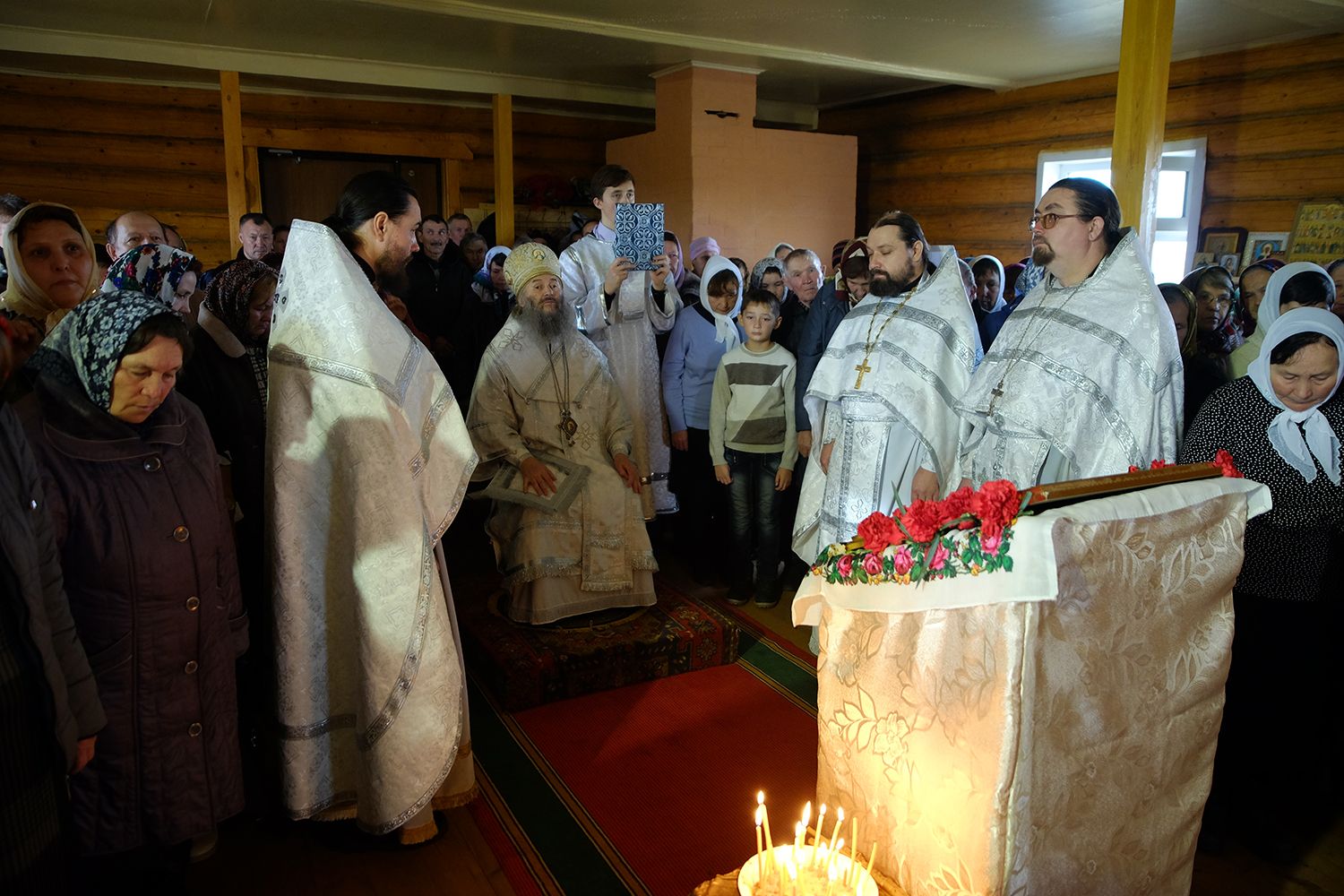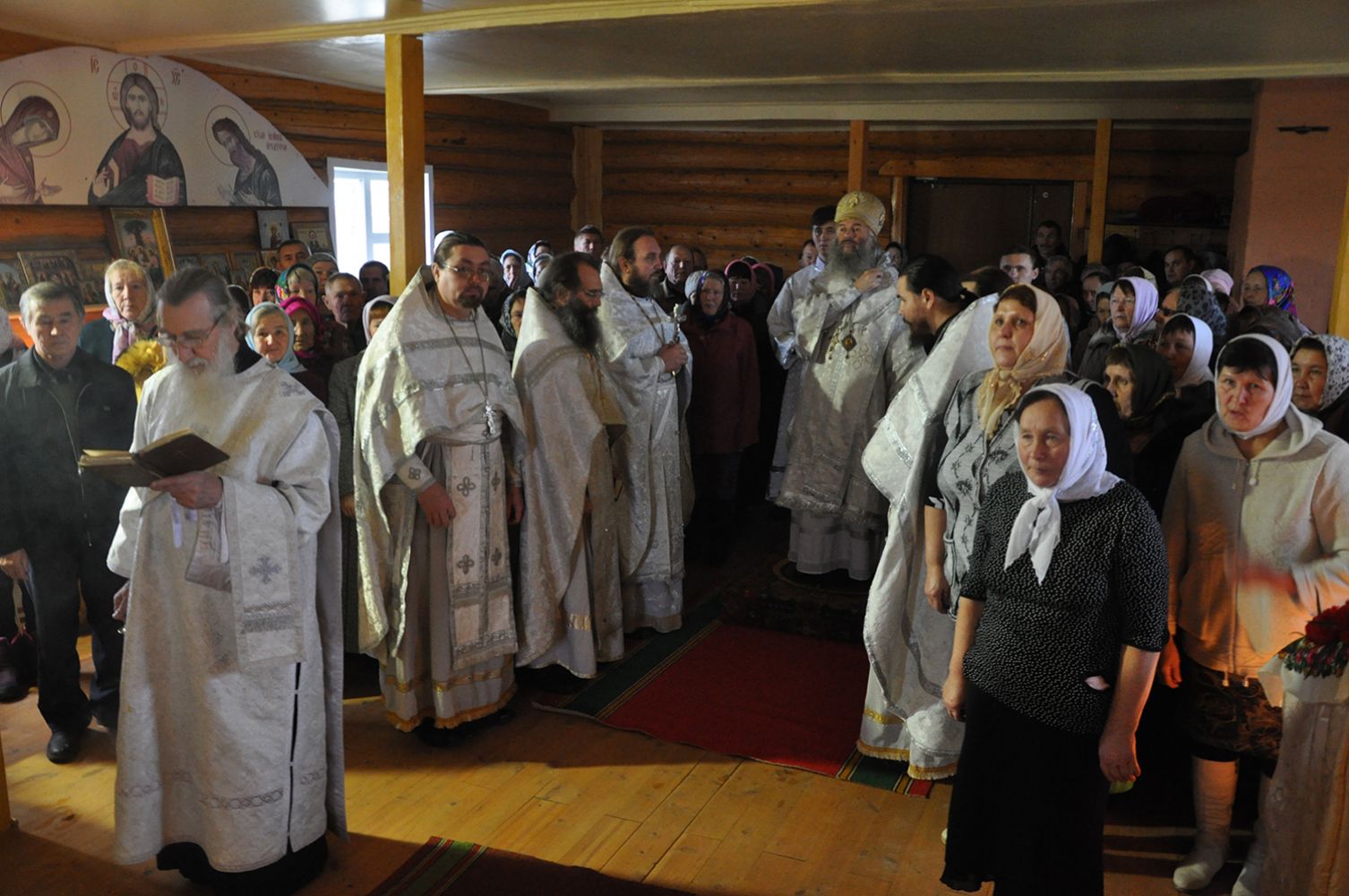 Владыке сослужили: секретарь Епархиального управления иеромонах Серафим (Пасанаев), настоятель храма протоиерей Николай Чузаев, настоятель Свято-Троицкого храма с.Красный Яр иерей Михаил Репин, клирик Никольского храма с.Кожласола иерей Владимир Яшин, настоятель Свято-Троицкого храма с.Помары иерей Сергий Петров и настоятель Свято-Троицкого храма с.Сотнур иерей Игорь Сапаев. Богослужебные песнопения исполнялись на церковно-славянском и марийском языках.