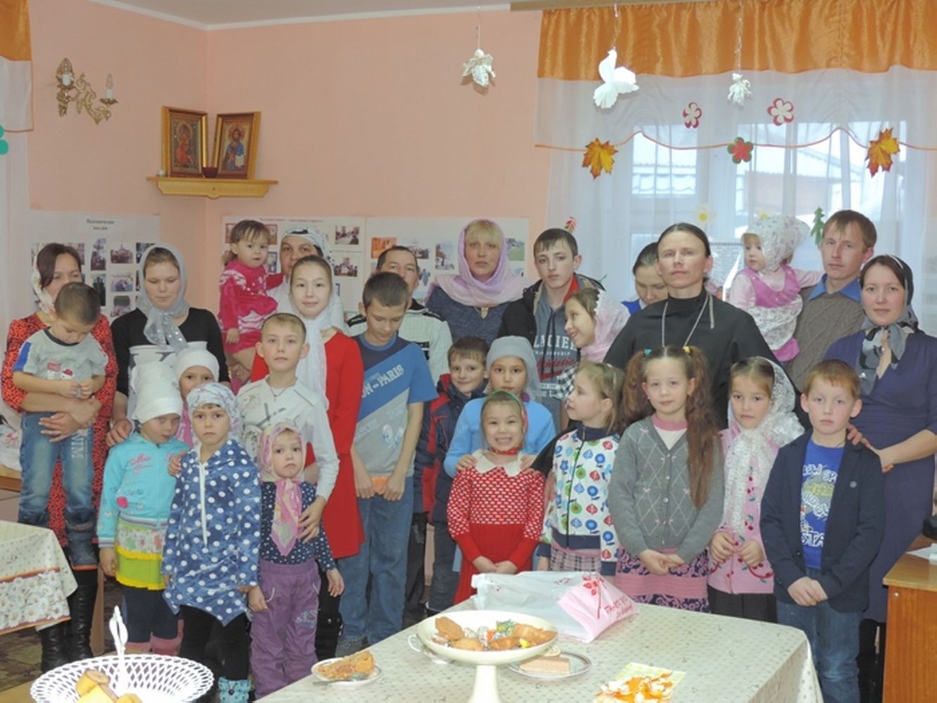 Накануне праздника, в субботу, в уютной трапезной собралось пять многодетных семей, опекаемых приходом, ученики воскресной школы при храме, настоятель храма иерей Василий Яшмолкин, и помощник настоятеля по социальной работе Г.П. Лямина.