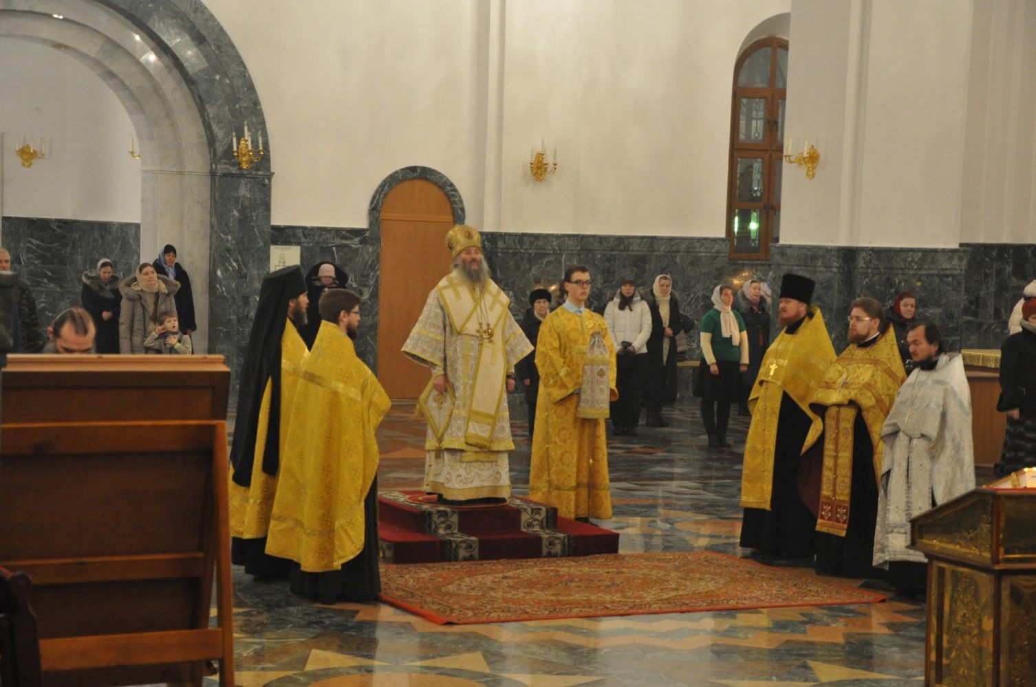 Владыке сослужили: секретарь Епархиального управления иеромонах Серафим (Пасанаев), ключарь собора протоиерей Сергий Поглазов, клирики храма: иереи Никифор Захаров, Артемий Промович, Евгений Самойлов и Евгений Шамаев.