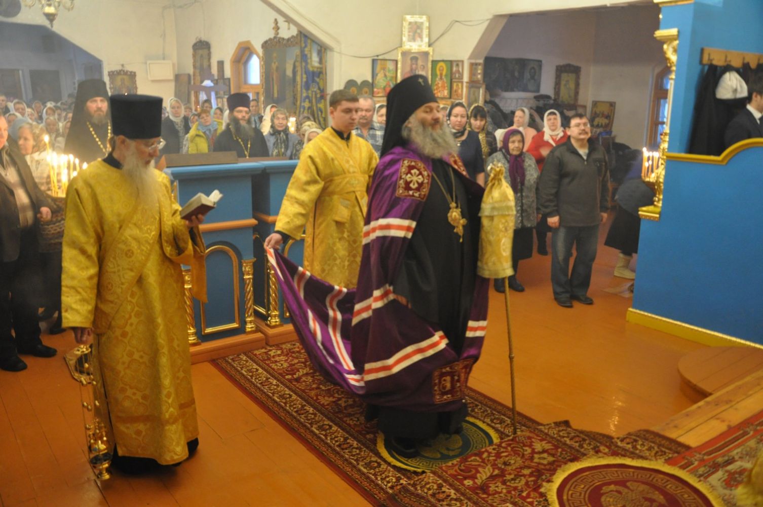 Владыке сослужили: секретарь Епархиального управления иеромонах Серафим (Пасанаев), благочинный Луговомарийского церковного округа, настоятель храма протоиерей Алексий Никитин и клирик храма иерей Владимир Яшин.