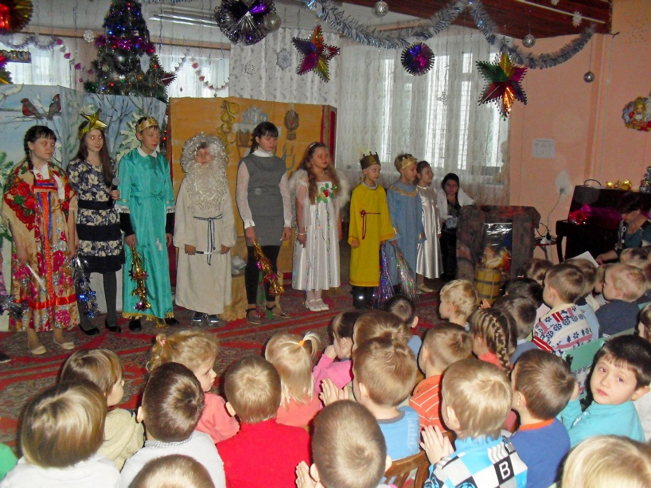 Юные артисты при входе встречали маленьких гостей и родителей. Представление началось с постановки спектакля «Рождественский дед». Декорации, костюмы участников перенесли зрителей в добрый мир поучительной сказки…