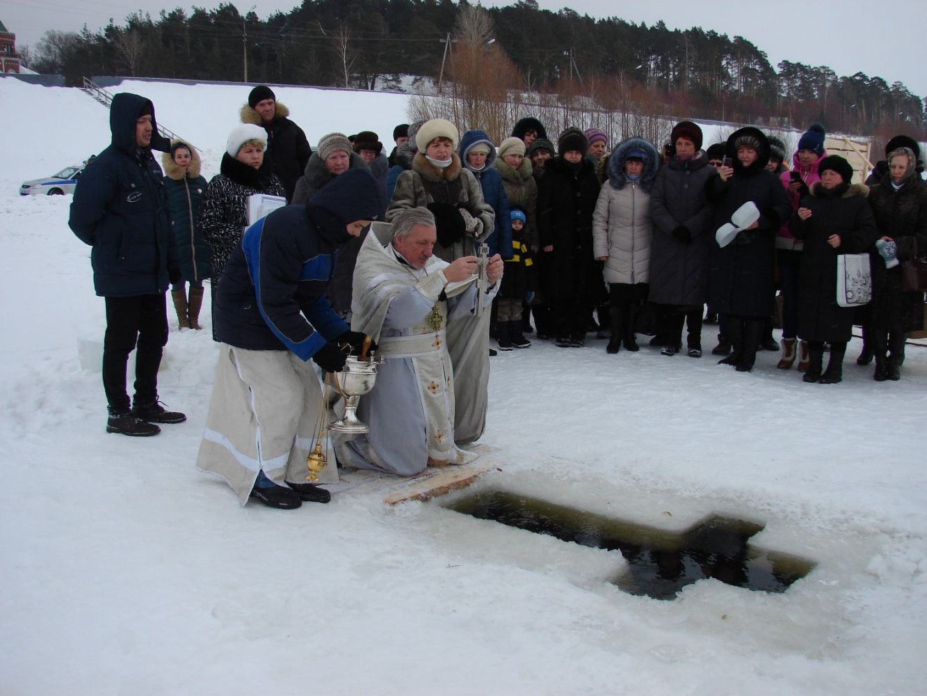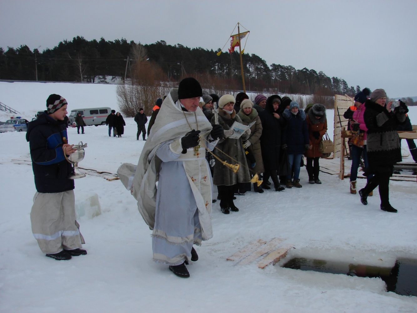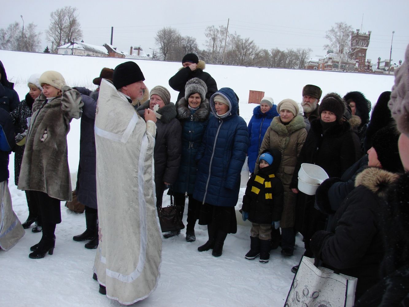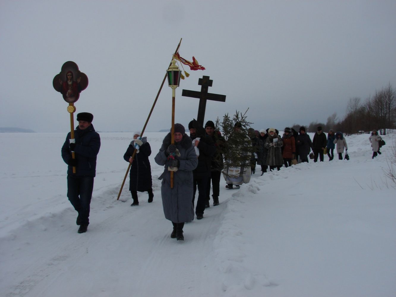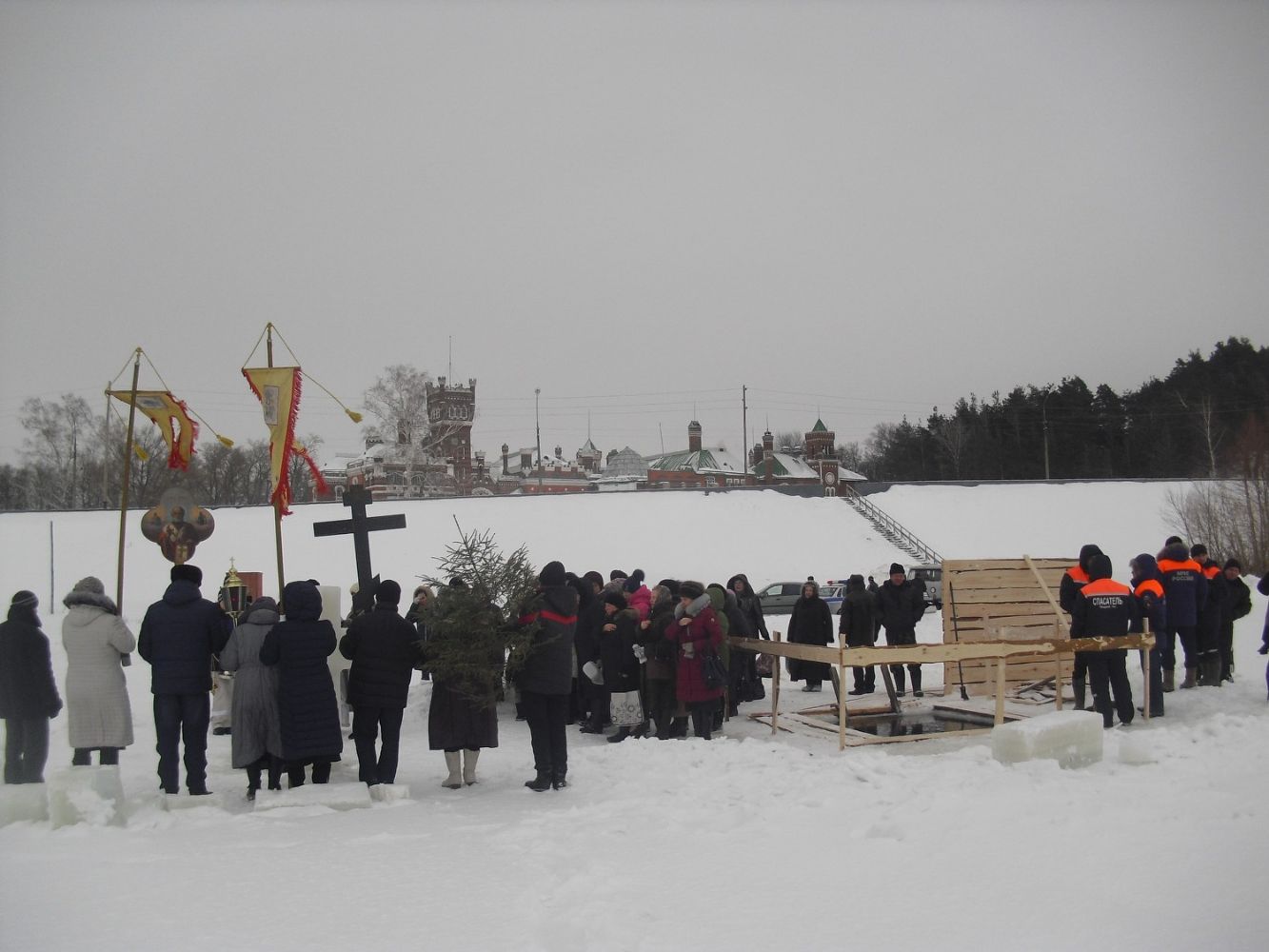 После праздничного Богослужения в Рождество Христово и двух святочных недель в храме Архангела Михаила п. Юрино вновь встреча великого праздника - Крещения Господня. Торопятся в церковь прихожане. На реке Волге перед замком Шереметева готова Иорданская купель и расчищена к ней дорожка.