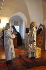 Владыке сослужили: секретарь Епархиального управления иеромонах Серафим (Пасанаев) и клирик монастыря иерей Михаил Лежнин.