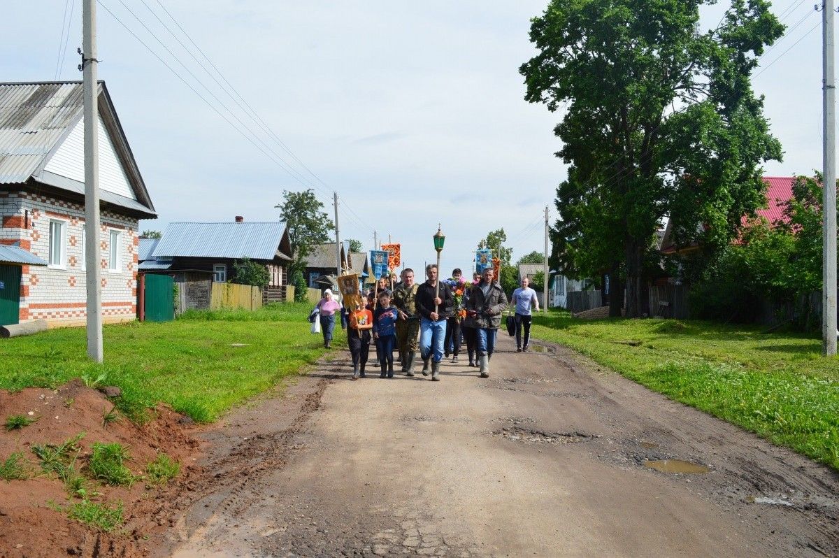 Далее путь пролегал по полю в деревню Поланур. Ее жители ожидали в самом начале деревни, прикладывались к иконе, проходили под ней, прикладывались к мощам. В центре деревни был накрыт стол, где можно было подкрепиться перед дальнейшей дорогой.