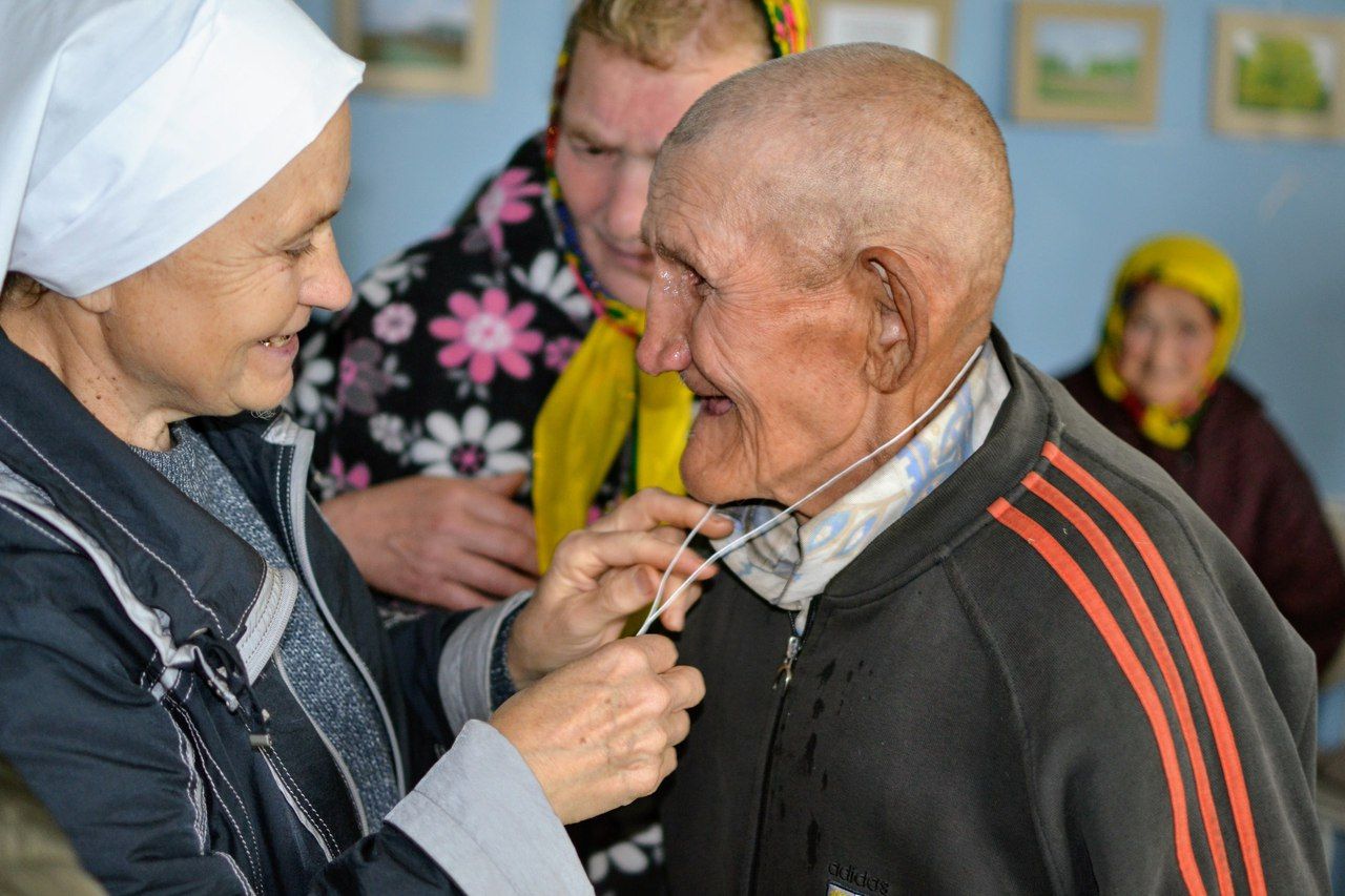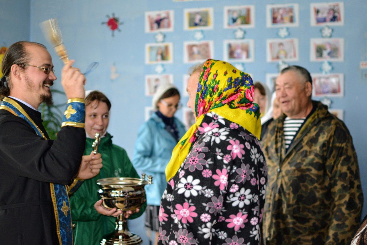 Встреча с жителями началась с молебна, который отслужил батюшка и на котором пели певчие миссионерского хора. После молебна отец Алексий произнес проповедь о десяти заповедях. После чего всем желающим были розданы крестики и православные молитвословы с крупным шрифтом. Затем всем нуждающимся - продуктовые наборы.