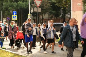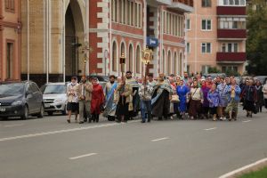 После Божественной литургии сонм священнослужителей во главе с Владыкой отправился крестным ходом с Мироносицкой иконой Пресвятой Богородицы в Успенский храм. Вместе с ними крестным ходом шли многочисленные жители Йошкар-Олы и верующие из районов Марий Эл.