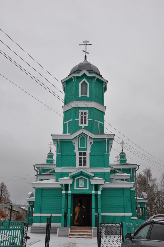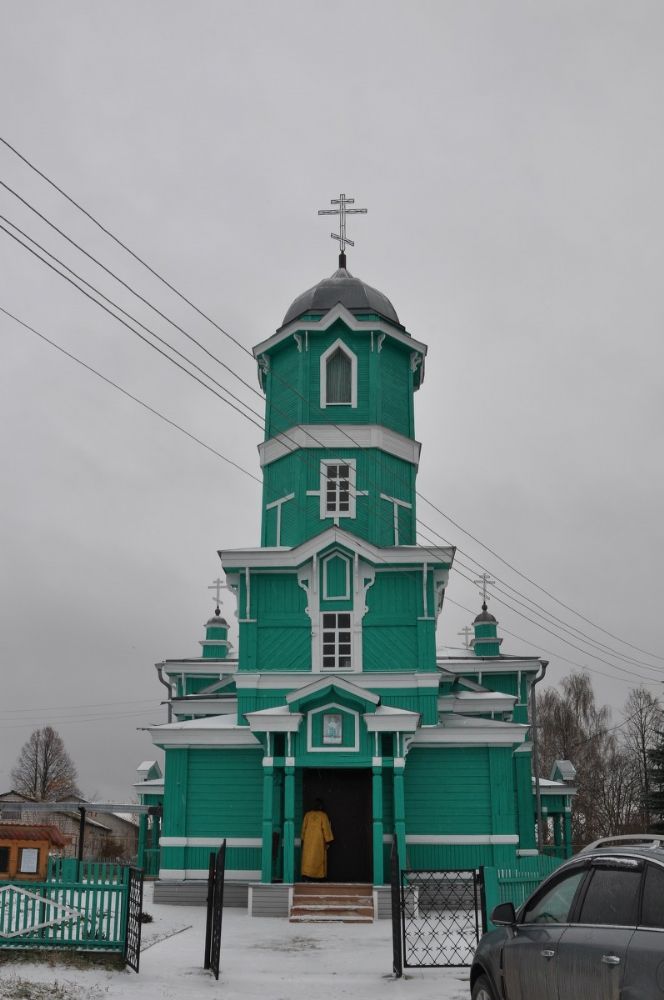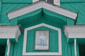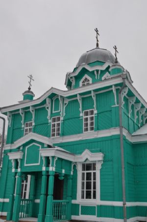 Но мастера не повторялись в своих умениях. Чкаринская церковь завершается не шатрами, а шлемовидными восьмигранными куполами. Церковь больше по объему. Восьмерик превратился в большой световой барабан. Наряднее выглядит внешнее декоративное убранство. В любую погоду из разных точек села этот цветок деревянной архитектуры смотрится величаво.
