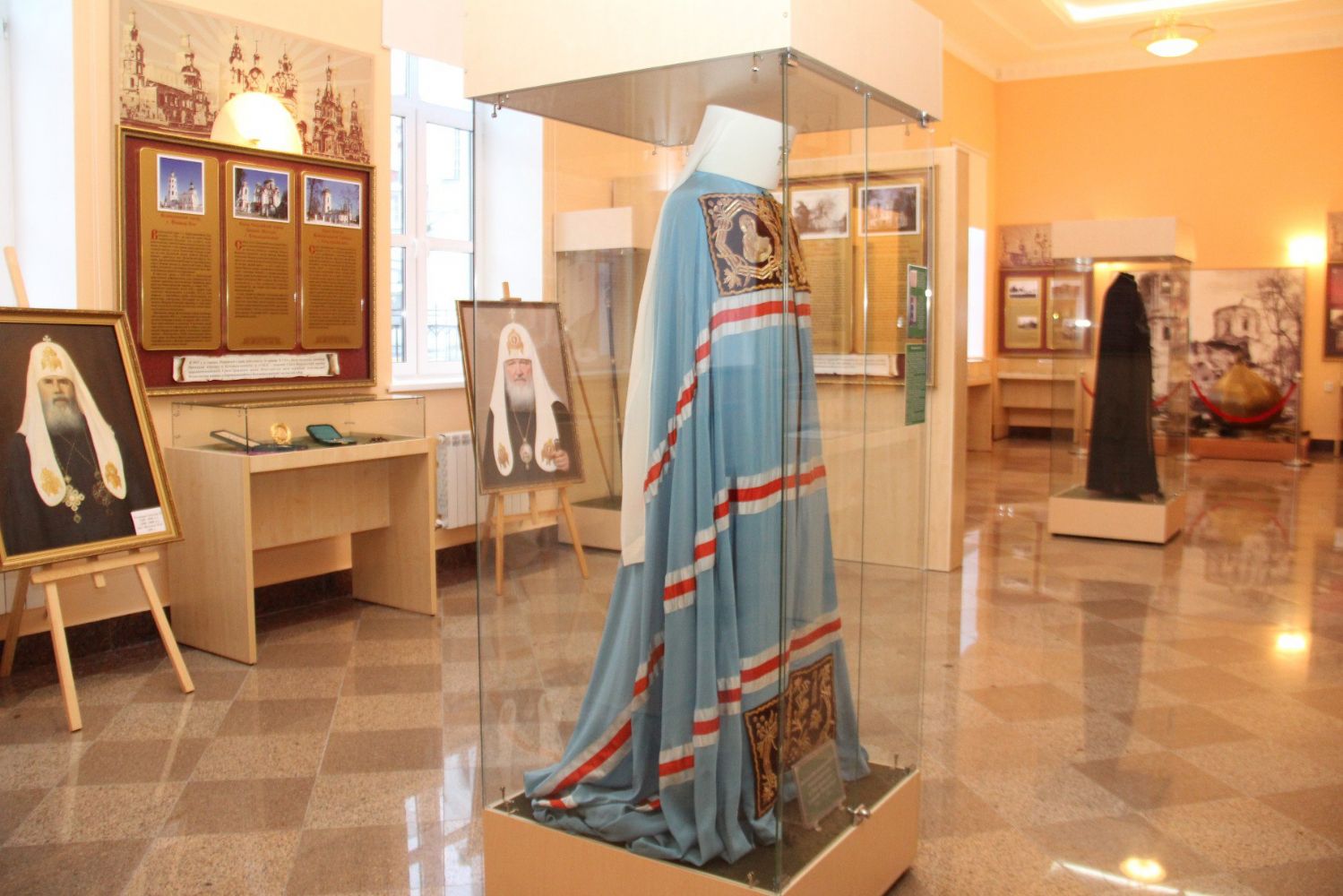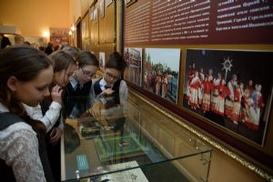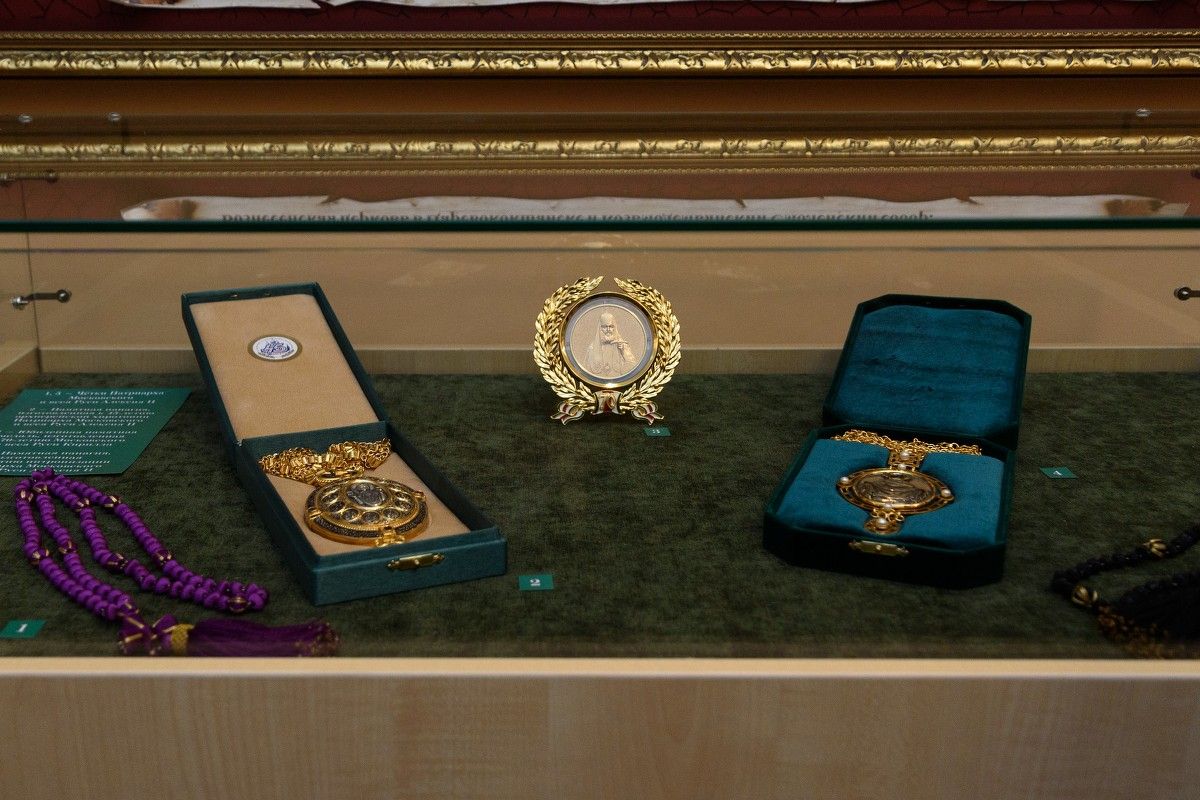 Для гостей была проведена увлекательная экскурсия по выставке, состоящей из двух разделов. В первом представлены портреты всех предстоятелей Русской Православной Церкви. Второй раздел посвящен Патриархам Московским и всея Руси Алексию II и Кириллу. Гости долго рассматривали уникальные церковные предметы, богослужебные облачения, принадлежавшие Патриарху Алексию II.