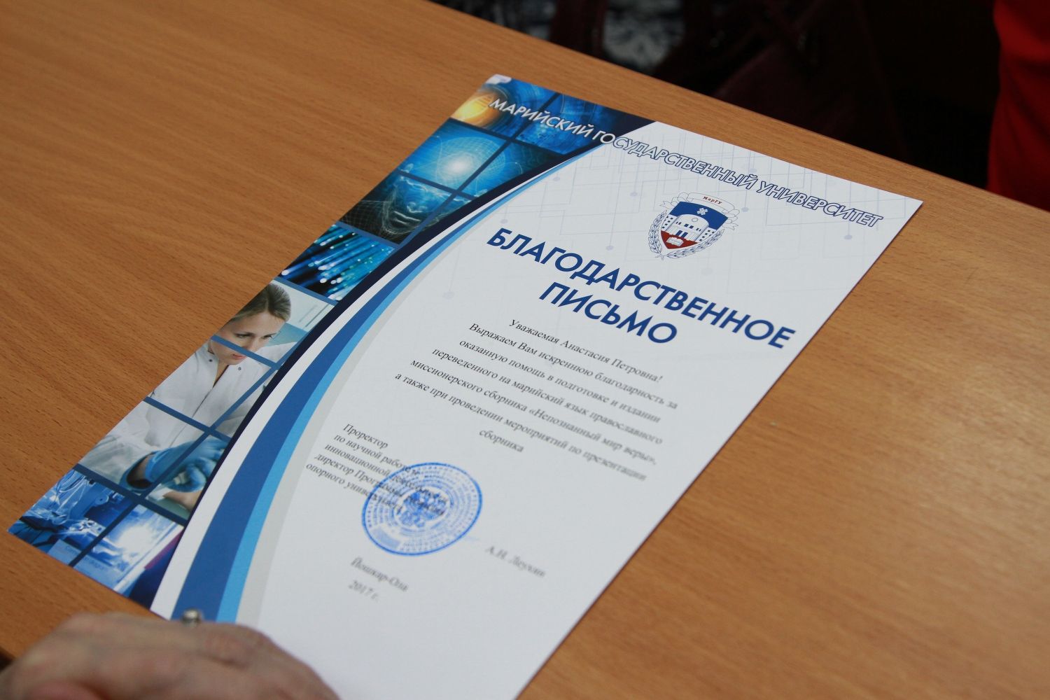 В завершении мероприятия были вручены благодарственные письма всем, кто принимал участие в работе над данным проектом. Руководитель проекта Лидия Сидоровна Матросова в своем выступлении отметила слаженность сотрудничества команды МарГУ и Йошкар-Олинской и Марийской епархии. Переведенный сборник будет способствовать знакомству коренного населения республики Марий Эл с традициями и уникальным наследием православной культуры, взаимообогащению культур и гармонизации межнациональных отношений в регионе. Лидия Сидоровна подчеркнула важность подобной работы и для развития теории и практики перевода с русского языка на марийский язык.