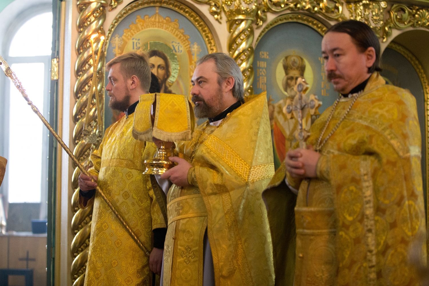 За Божественной литургией митрополиту Иоанну и епископу Феофану сослужили: настоятель собора святителя Николая Мирликийского города Волжска протоиерей Виталий Михеев, клирики собора иерей Александр Усков, иерей Алексий Скрябин, клирик храма Рождества Пресвятой Богородицы села Семеновка протодиакон Михаил Козловский и диакон Иоанн Захаров.