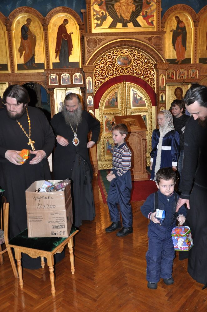 Дети священников и диаконов исполнили святочные песнопения и прочитали стихи. Владыка принял поздравления и подарил детям сладкие подарки и игрушки.
