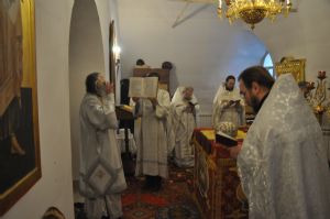 Владыке сослужили секретарь Епархиального управления иеромонах Серафим (Пасанаев), настоятель храма Вознесения Господня города Йошкар-Олы митрофорный протоиерей Евгений Кутырев, клирики собора Вознесения Господня города Йошкар-Олы иерей Владимир Камышев, иерей Димтрий Копылов, диакон Сергий Метелев и клирик храма Рождества Пресвятой Богородицы села Семеновка протодиакон Михаил Козловский.
