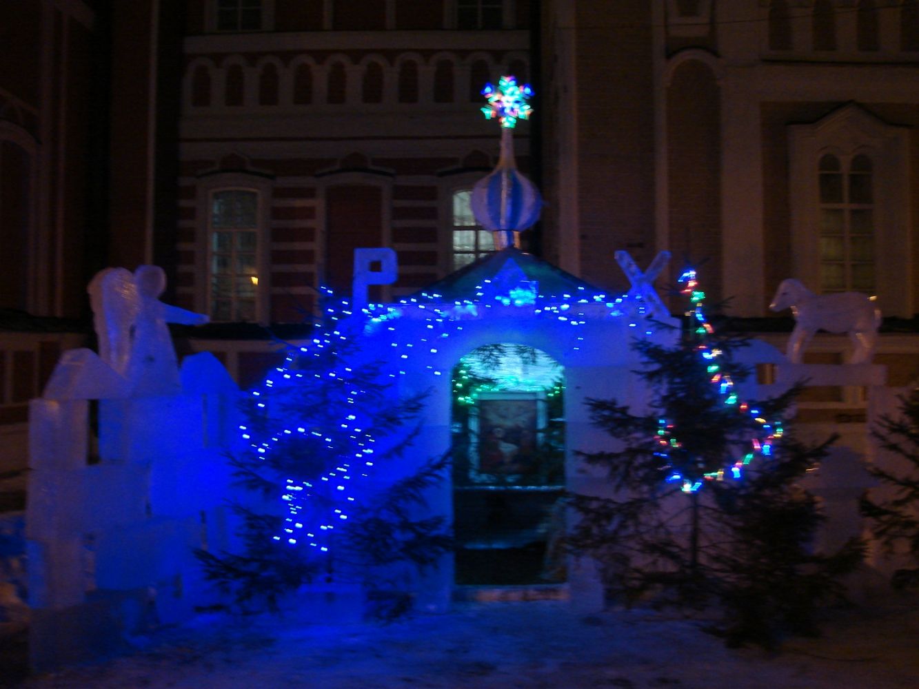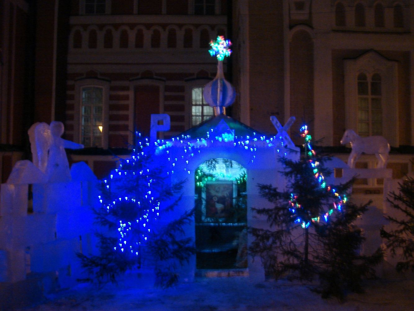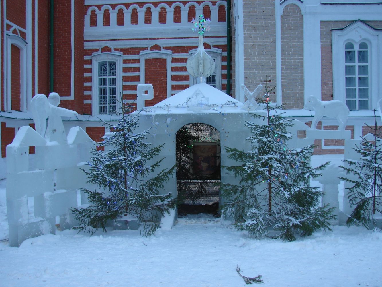 В первую очередь, ели на территории церковной ограды облачились в гирлянды. Праздничные огни напоминали прохожим о приближении радостных событий. А накануне праздника у северной стены храма появился ледяной домик-вертеп и ледяные скульптуры вокруг него. С этого дня поход в Божий храм не обходился без посещения вертепа.