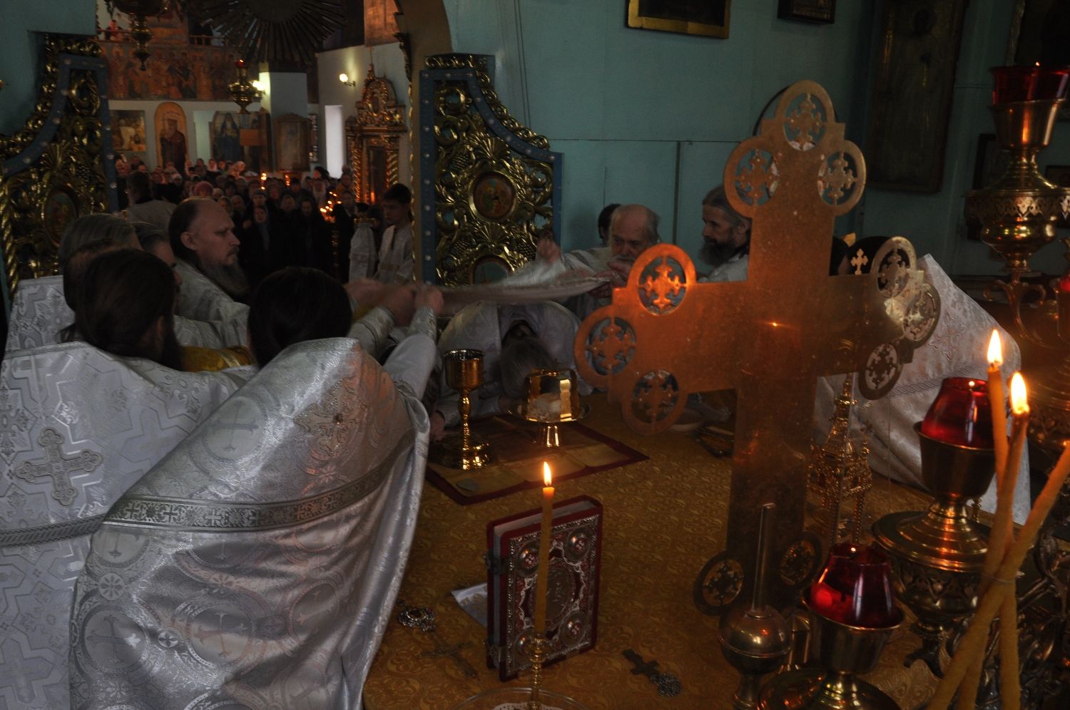 Архипастырям сослужили: секретарь Епархиального управления настоятель храма иконы Божией Матери «Всех Скорбящих Радость» протоиерей Александр Михайлов, духовник епархии настоятель храма святого праведного Иоанна Кронштадтского протоиерей Евгений Панин, ключарь Никольского кафедрального собора протоиерей Виталий Михеев, настоятель храма Покрова Пресвятой Богородицы села Алексеевское протоиерей Владимир Легач, настоятель храма Богоявления Господня п. Морки протоиерей Леонтий Очетов, настоятель Свято-Троицкого храма села Помары иерей Сергей Петров, клирики Никольского кафедрального собора иерей Александр Усков, иерей Алексей Скрябин, настоятель храма Пресвятой Богородицы села Эмеково протоиерей Евгений Усков, настоятель храма Рождества Христова села Арино протоиерей Николай Чузаев, клирик храма Рождества Пресвятой Богородицы села Семеновка протодиакон Михаил Козловский и диакон Иоанн Захаров.