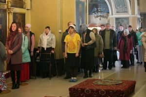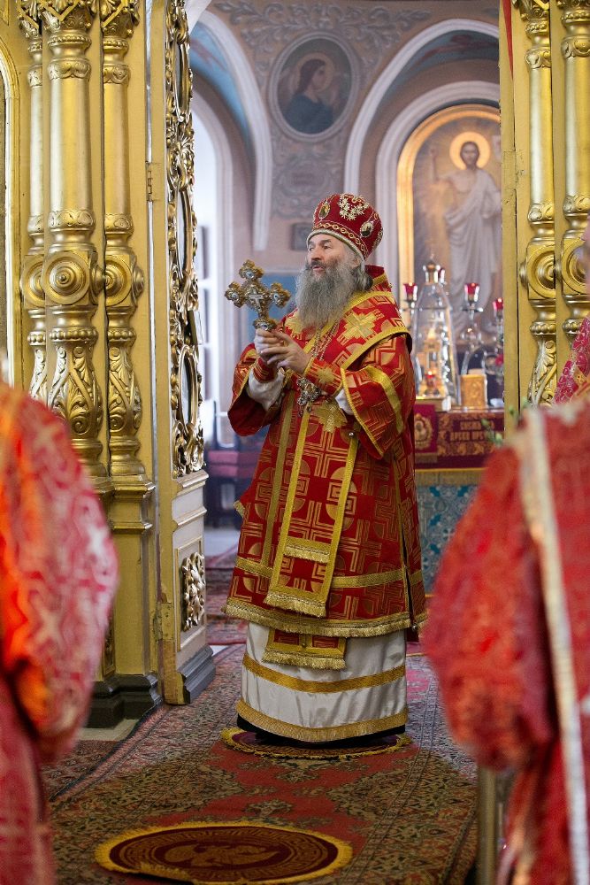 Владыке сослужили секретарь Епархиального управления иеромонах Серафим (Пасанаев), настоятель храма протоиерей Михаил Ильин, клирики храма протоиерей Павел Матвеев, иерей Димитрий Иванов, иерей Сергий Асланов, иерей Павел Дурандин, протодиакон Михаил Козловский, диакон Александр Жирнов и диакон Димитрий Смирнов.