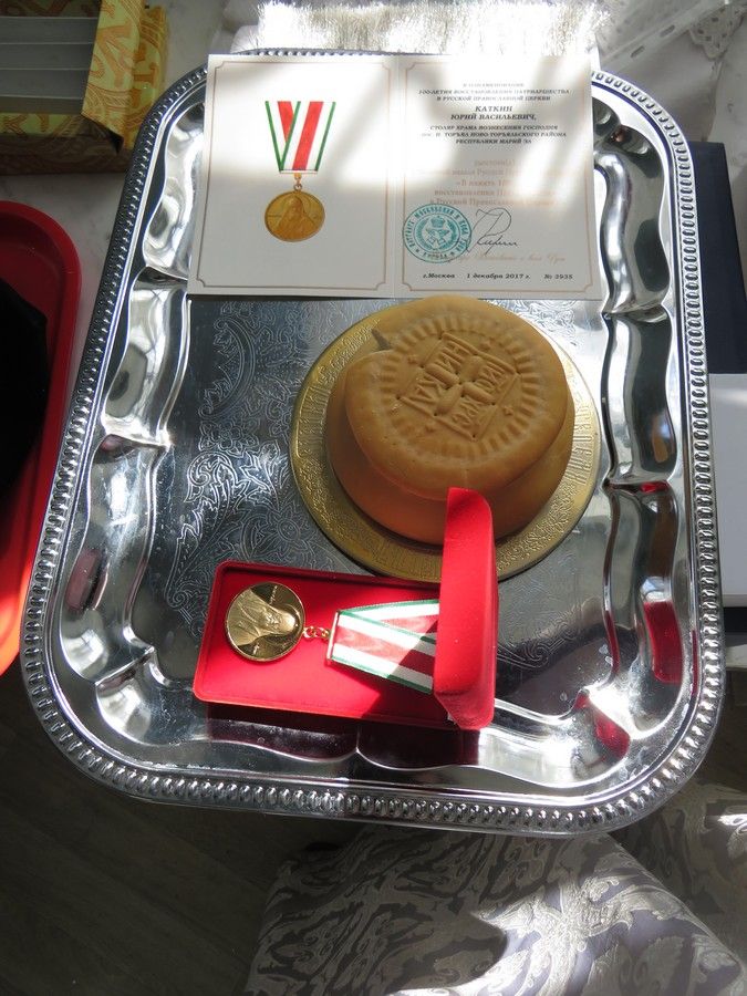 По благословению Святейшего Патриарха в ознаменование 100-летия восстановления Патриаршества в Русской Православной Церкви столяр Вознесенского храма поселка Новый Торъял Юрий Васильевич Каткин был удостоен медали святителя Тихона, Патриарха Московского и всея Руси. Преосвященнейший епископ Феофан торжественно вручил медаль Юрию Васильевичу.