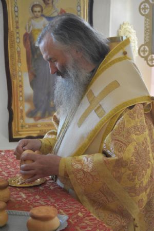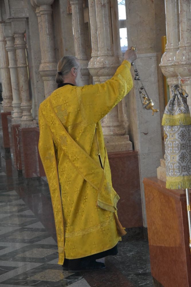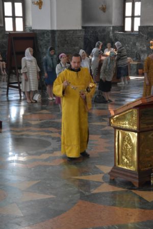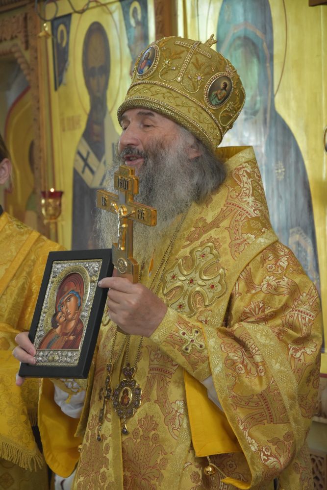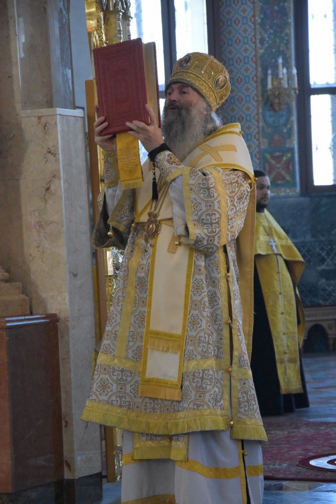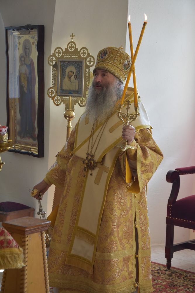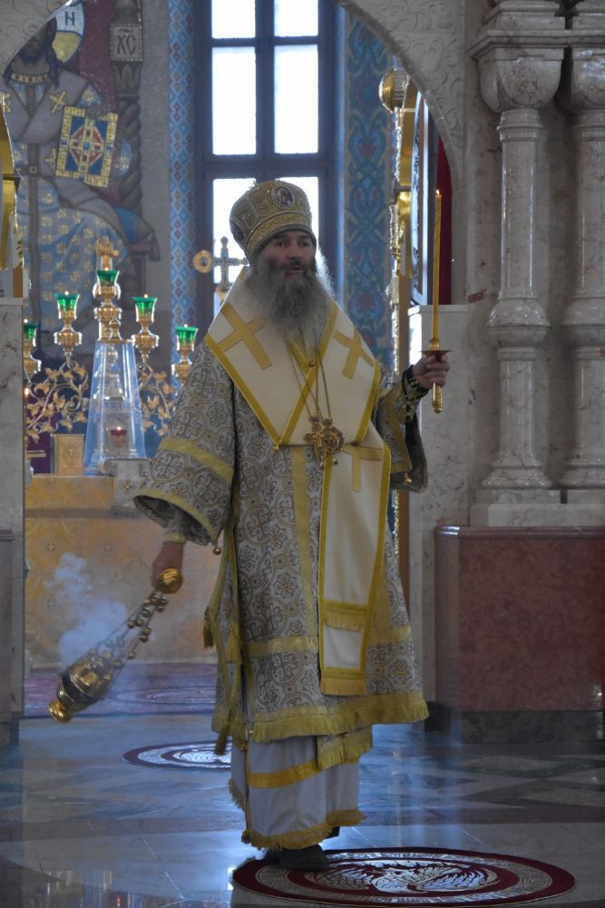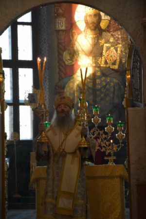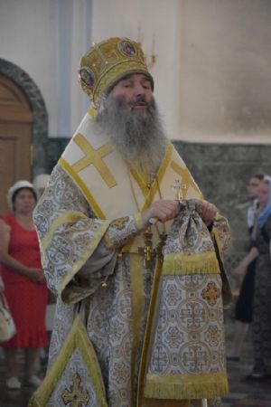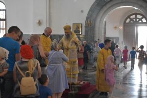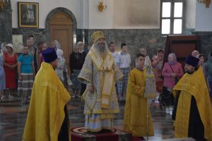 Владыке сослужили ключарь собора протоиерей Сергий Поглазов, клирики собора иерей Никифор Захаров, иерей Артемий Промович, диакон Игорь Коваль и клирик храма Рождества Пресвятой Богородицы села Семеновка протодиакон Михаил Козловский.